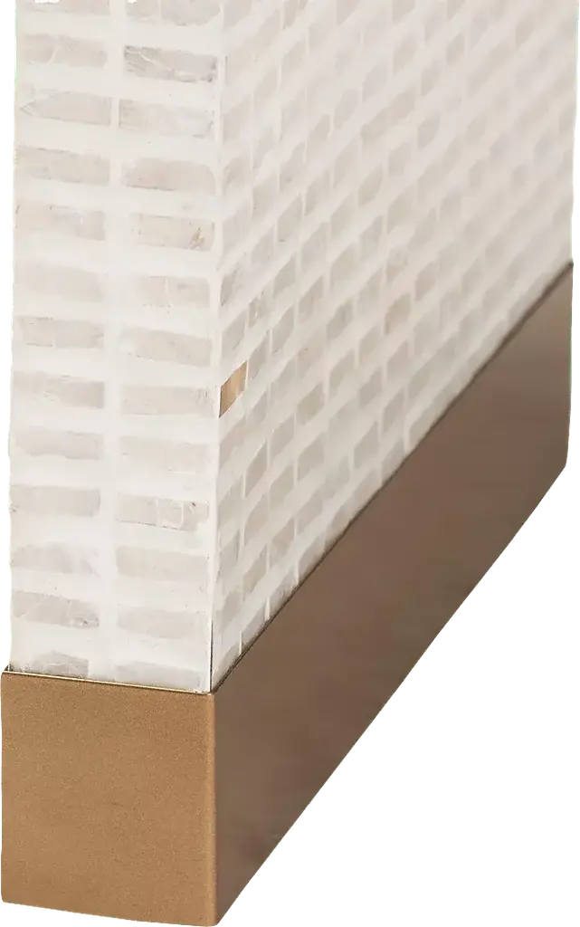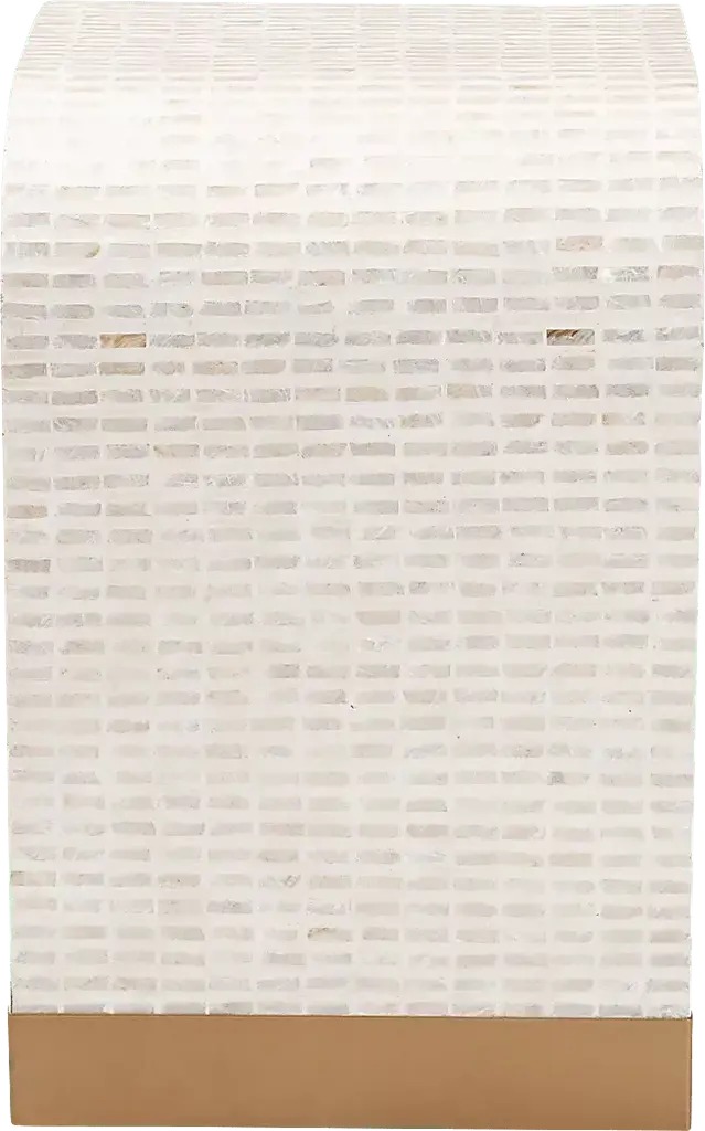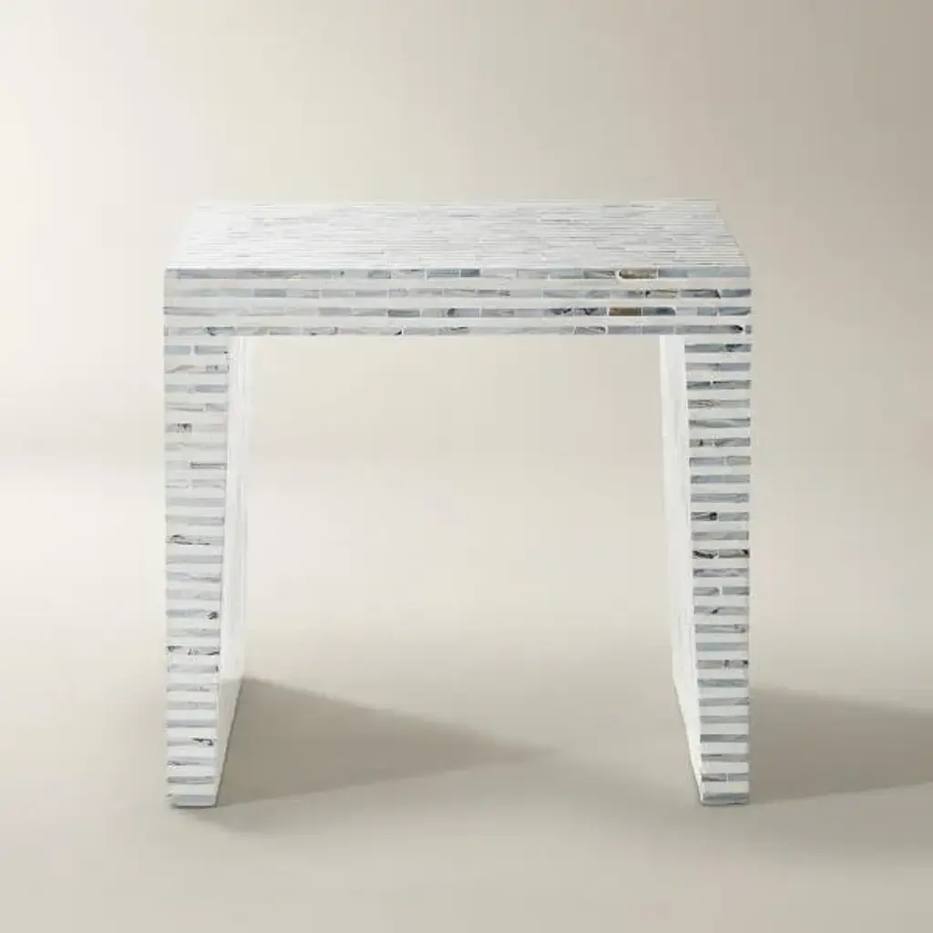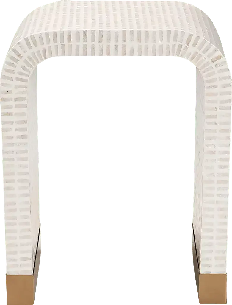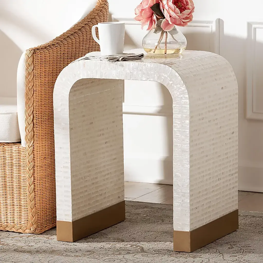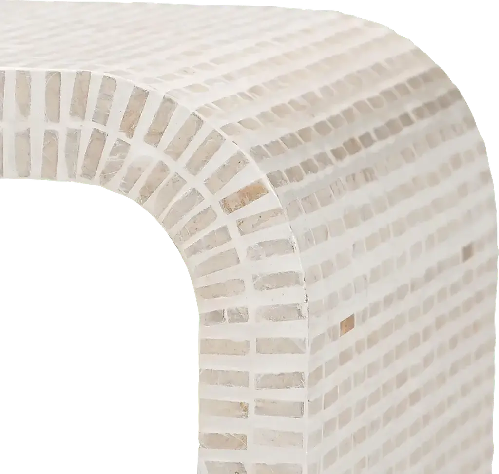 Immerse your space with the vibrant artistry of the stunning Skihi white end table. This coastal piece consists of a sturdy wood frame intricately encased in natural Capiz shell. Its waterfall silhouette exudes soothing geometry fulfilling the needs of any shared space. The Skihi utilizes broad, straight legs for excellent stability and support in eye-catching design.