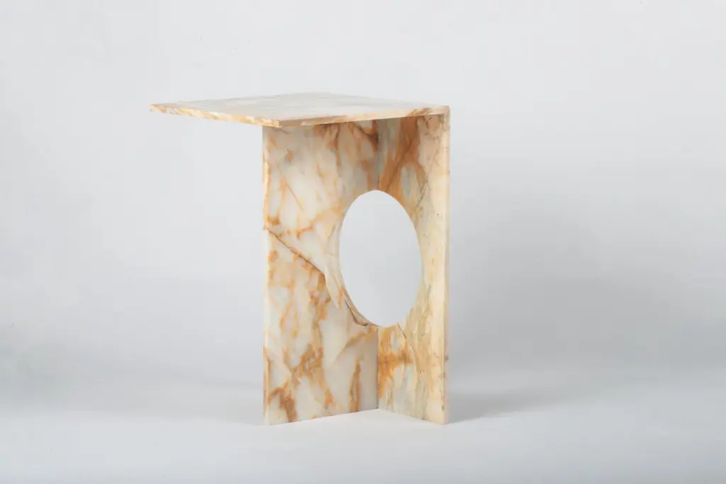Sky Blue Marble Ola Side Table by Studio MohsDimensions: W 30 x D 30 x H 45 cmMaterials: Marble.The Sky Blue marble originating from Alanya-Gazipaşa has orange-green and gray-blue veins on a white background. It can give varying colors and patterns depending on different cutting techniques. It is a translucent marble and provides light transmittance. Sky Blue is a preferred marble for interior applications, table and coffee table designs, lighting and decorative products.Studio Mohs is a creative design studio based in Istanbul searching for different design experiences in a living environment. The works involve furniture and products combining old material with modern style and inspired by basic shapes that create clean aesthetics. The meaning of Mohs is the hardness and resistance scale of minerals. Related to that, the beginning of a journey starts with the intimacy with marble and stone. The origins of Studio Mohs is coming from a long time experience of marble quarries. Years of working with this material as “Demirtas Mining Company” has evolved into furniture, interior, and product design. The journey from nature to our living spaces has begun with the sculptural and completely marble coffee table designs produced in the marble factory in Alanya.