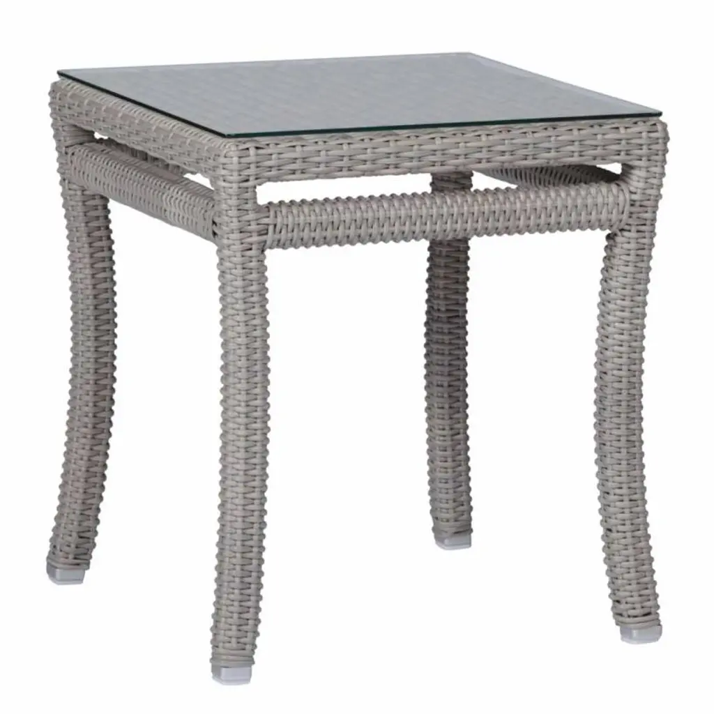 The Club Woven End Table features timeless outdoor wicker styling crafted from highly durable and weather-resistant N-dura™ resin wicker—guaranteed to not experience any significant color change for 5 years. A sturdy wrought aluminum base and glass top surface make this accent table a perfect fit in a variety of outdoor furnishing settings.
