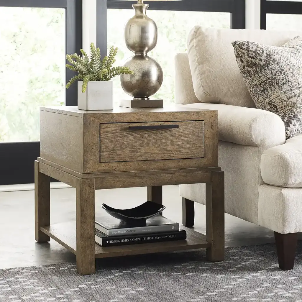 The Evans Drawer End Table from the Skyline collection combines timeless elegance with practical functionality. Crafted from split heart white oak veneers, it showcases a rich natural grain that adds warmth and depth to any space. A single drawer provides discreet storage, while the lower shelf offers additional versatility for display or organization. Designed with clean lines and a refined finish, this piece effortlessly balances sophistication and utility, making it a perfect complement to a variety of interiors.