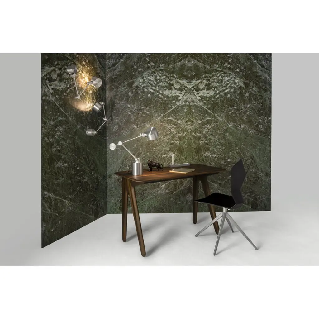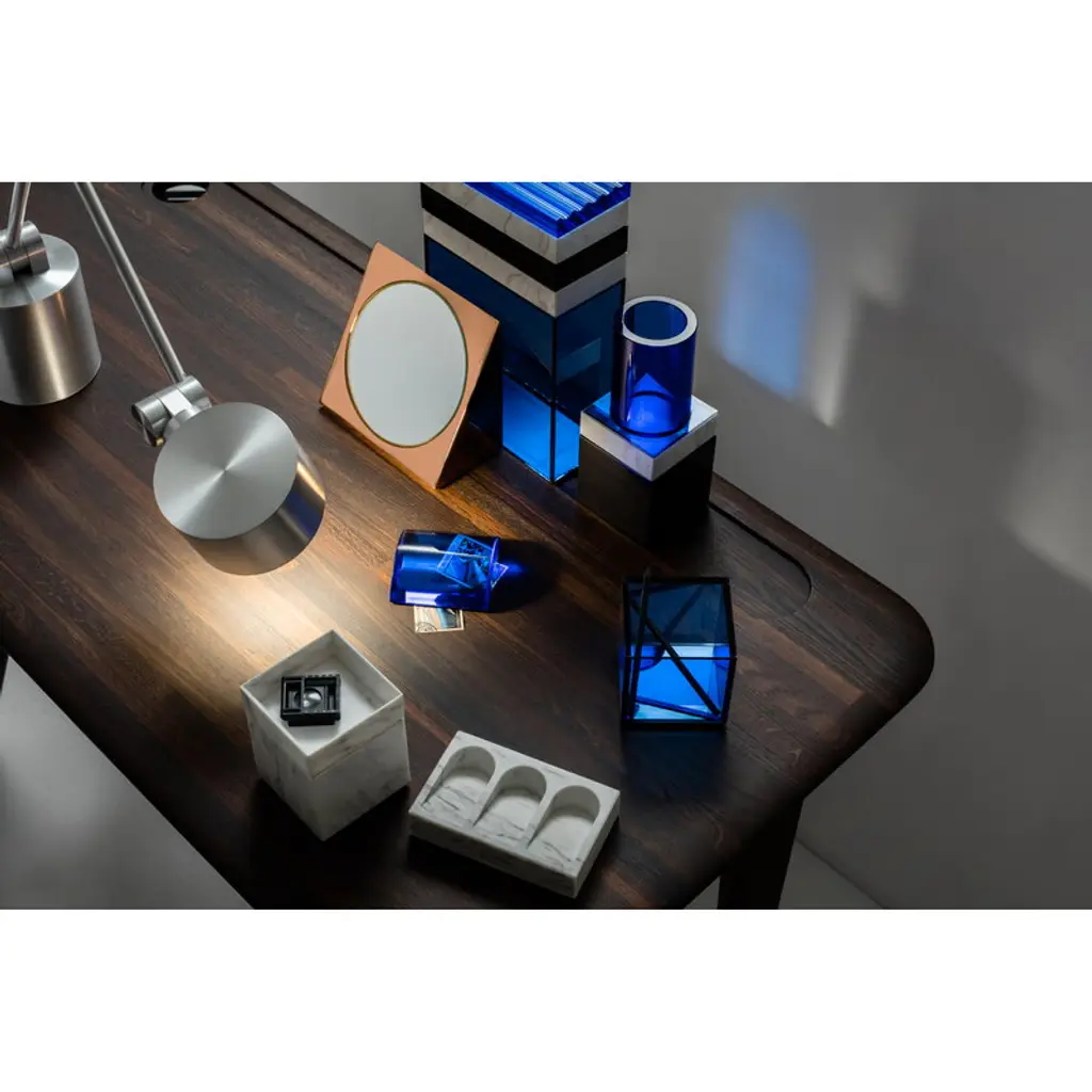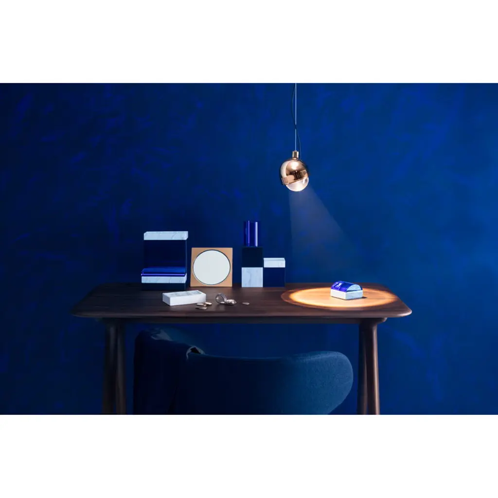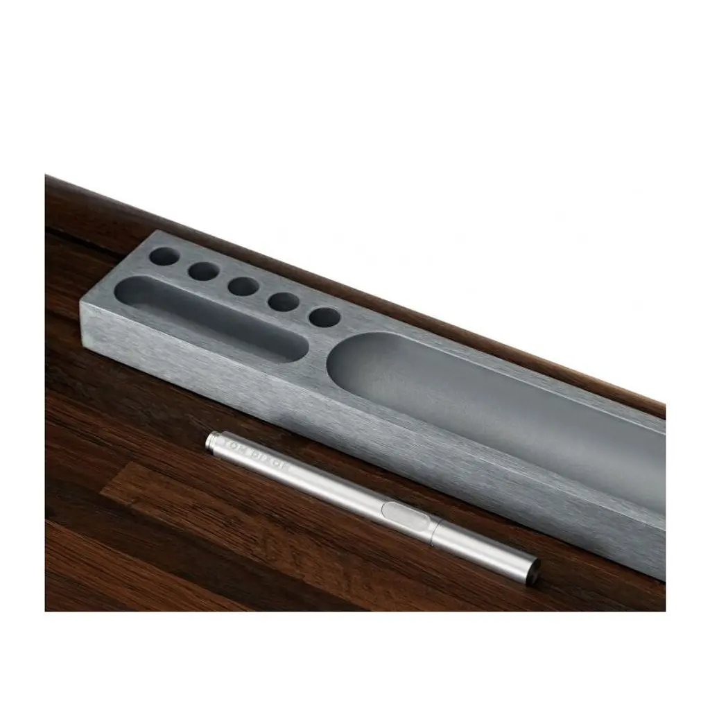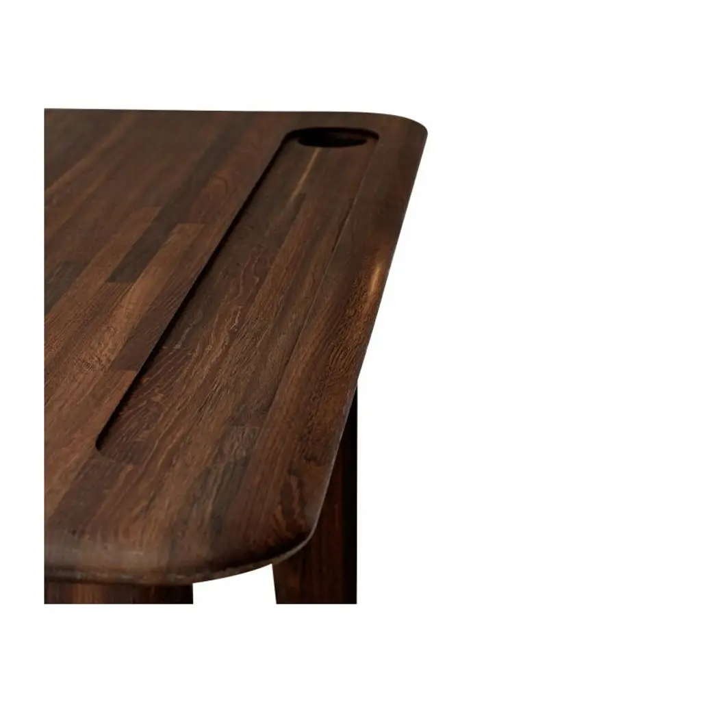 Tom Dixon's Slab desk borrows its design language from Victorian school desks. The strong look of the Slab desk is softened by the rounded corners of the tabletop and the attractive, sloping position of the legs. The oak table features a traditional inkwell, updated for the modern age: instead of ink pens, it hides messy wires and cables. There is also a pen slot on the tabletop where writing instruments can be stored. The multi-purpose Slab is ideal as a desk in a home office, a make-up table in the bedroom or a charming side table in the living room, where you can sit down to read or just to check your phone. This stylish table also finds a place in public spaces, such as hotel rooms or library reading rooms.