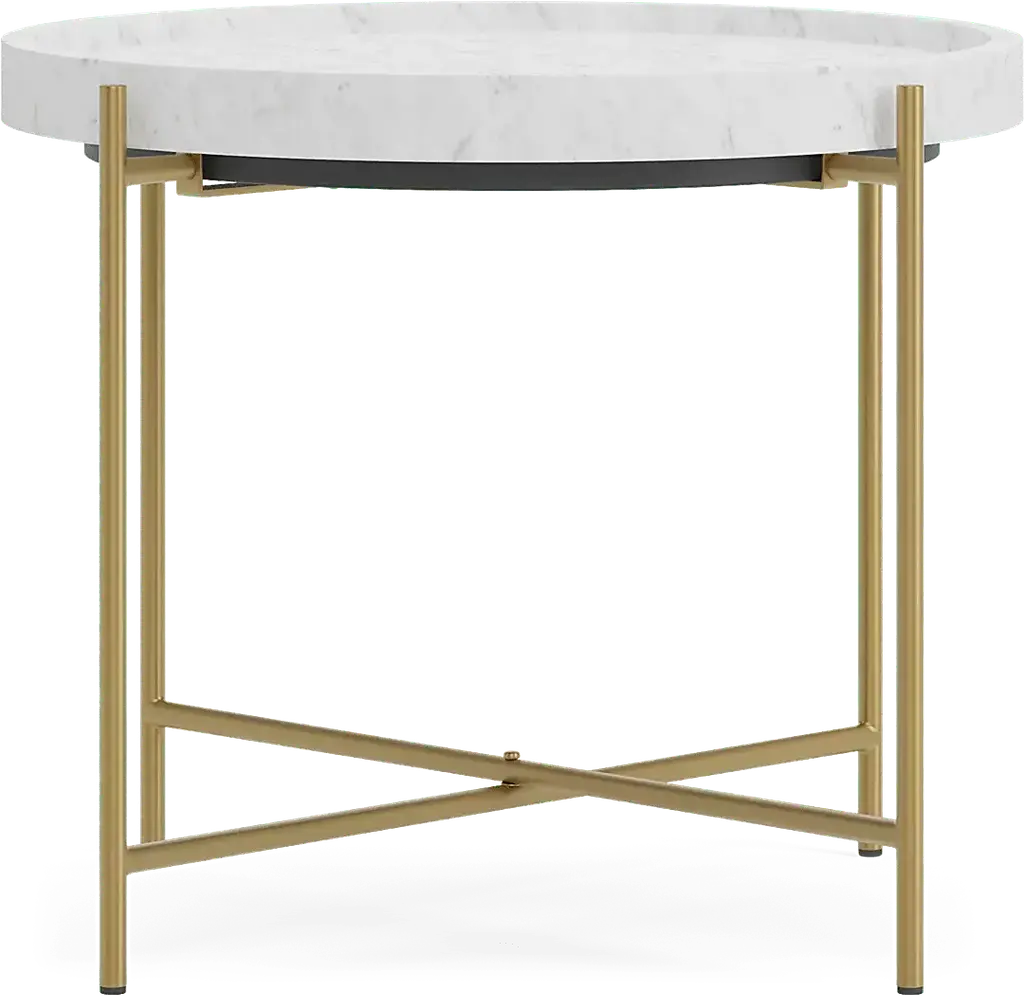 Boasting elegance and sophistication through shimmering base accents is the Slabtown end table. Transitional in style and crafted of a white marble tabletop with gold metal legs, this table's luxurious feel delivers a stylish and classy element to your living space.