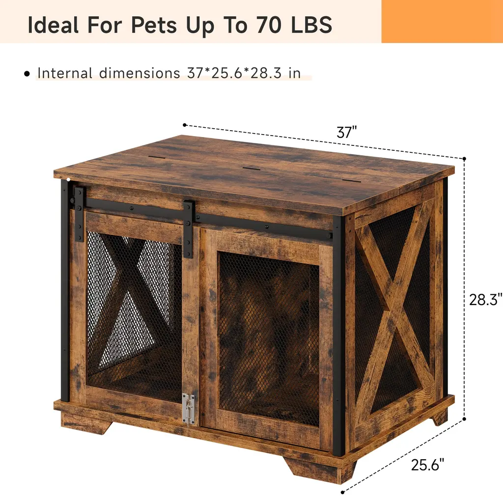 Sliding Barn Door: Tired of tripping over the dog door when walking? No worries. With our sliding door dog crate, you can say goodbye to those accidents. The sliding door design ensures that it won't obstruct people walking when opening the door. Plus, it doubles as a den-like dog house, providing your furry friend with a comfortable and secure space. 2-Position Removable Divider: Our dog crate is perfect for crate training your puppy. The removable divider can be adjusted or taken out as your puppy grows, allowing you to create the ideal space for them. This ensures that your dog always has a suitable and comfortable area while promoting a sense of security. Flip-up Top Opening: Say hello to convenience with our flip-up furniture dog crate. Designed specifically to comfort dogs during crate training, the wide opening (34.6 IN* 11.9IN) is ideal for even adult dogs. With a maximum load capacity of up to 200 lb, it provides ample space for your furry friend. Safe & Considerate: We prioritize the safety and security of your pet. Our dog crate features a sturdy metal latch on the door, ensuring that your dog remains safe and secure inside. Additionally, it protects your furniture from curious or destructive puppies when you're away, while also keeping them out of potentially dangerous situations when you can't supervise them. Classic Style: Our dog crate serves as both a cozy home for your beloved pet and a stylish addition to your living space. With its classic design, it seamlessly blends in with your home decor. It's the perfect gift for both your furry family member and yourself, providing a functional and beautiful end table that expands your space. Features: Flip-up Top Opening The flip top plate lets you play with puppies at any time and observe them.Dog cage with internal partitions, which can adjust the position of the divider as your dog grows.The divider can also be removed to accommodate a large dog. Sliding Door The sliding door dog cage is convenient for dogs to enter and exit, and it will not affect people's walking when the door is opened. The metal latch The metal latch on the door is solid to improve safety and security. The crate protects your furniture from curious or destructive puppies when you are away.
