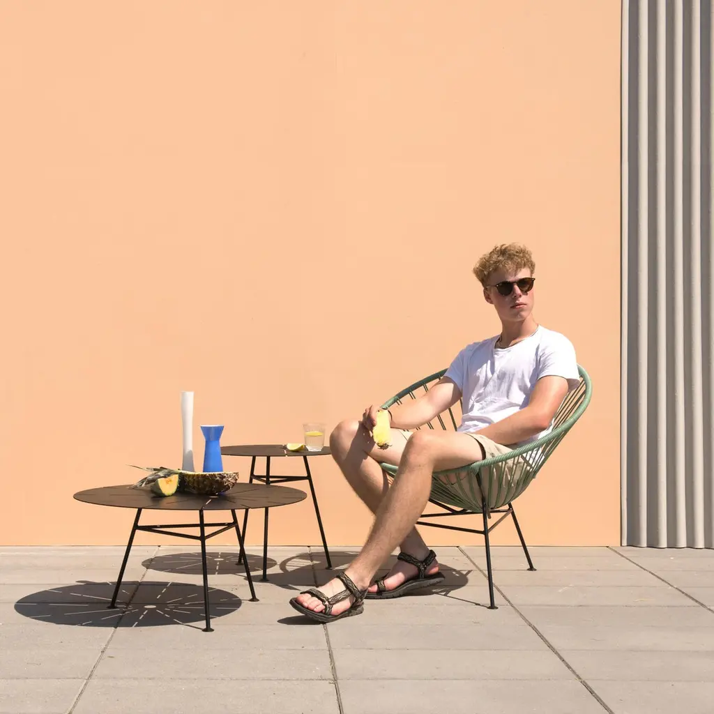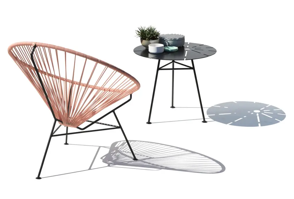 Small And Tall Bam Bam Table by OK DesignDimensions: D 50 x H 44 cm.Materials: Powder-coated metal.Available in small and tall or big and low.Available in black ash, natural oak, or all metal. Please contact us.The Bam Bam table is a stunning piece of furniture, inspired by the rays in the Acapulco chair design. It is a perfect companion to the Acapulco and Condesa chair but the classic design also works great on its own. The table is a versatile piece that can be used as a coffee table or side table.Available in two sizes and two finishes – stained black ash and natural oak – the Bam Bam table is made from high-quality materials. The top is crafted from veneered MDF in Denmark, while the frame is powder-coated metal manufactured in the EU.The wooden tops are not suitable for outdoor use. In case you want to use it outside we recommend that you purchase the Bam Bam table in all metal.OK Design was founded by the Danish couple: Jacob Fasting and Kirsten Krogh. Jacob began his entrepreneurial life by founding the first bicycle courier company in Mexico City. Later his adventurous spirit led him down a new, creative path together with the architect Kirsten Krogh.Kirsten and Jacob initiated their success in Europe by introducing the traditional woven furniture from Mexico. Today they create in-house furniture as well as work in collaboration with international designers.OK Design is based in Copenhagen, the environmentally friendly production takes place in the EU, and the designs are sold in more than 40 countries worldwide.Their latest endeavour is Stella Atlántico in Isla de la Palma. A 4 floor building reaching towards the stars and located on the rim of the world’s largest erosion crater. Stella Atlántico functions as a combined visual showroom and holiday home.