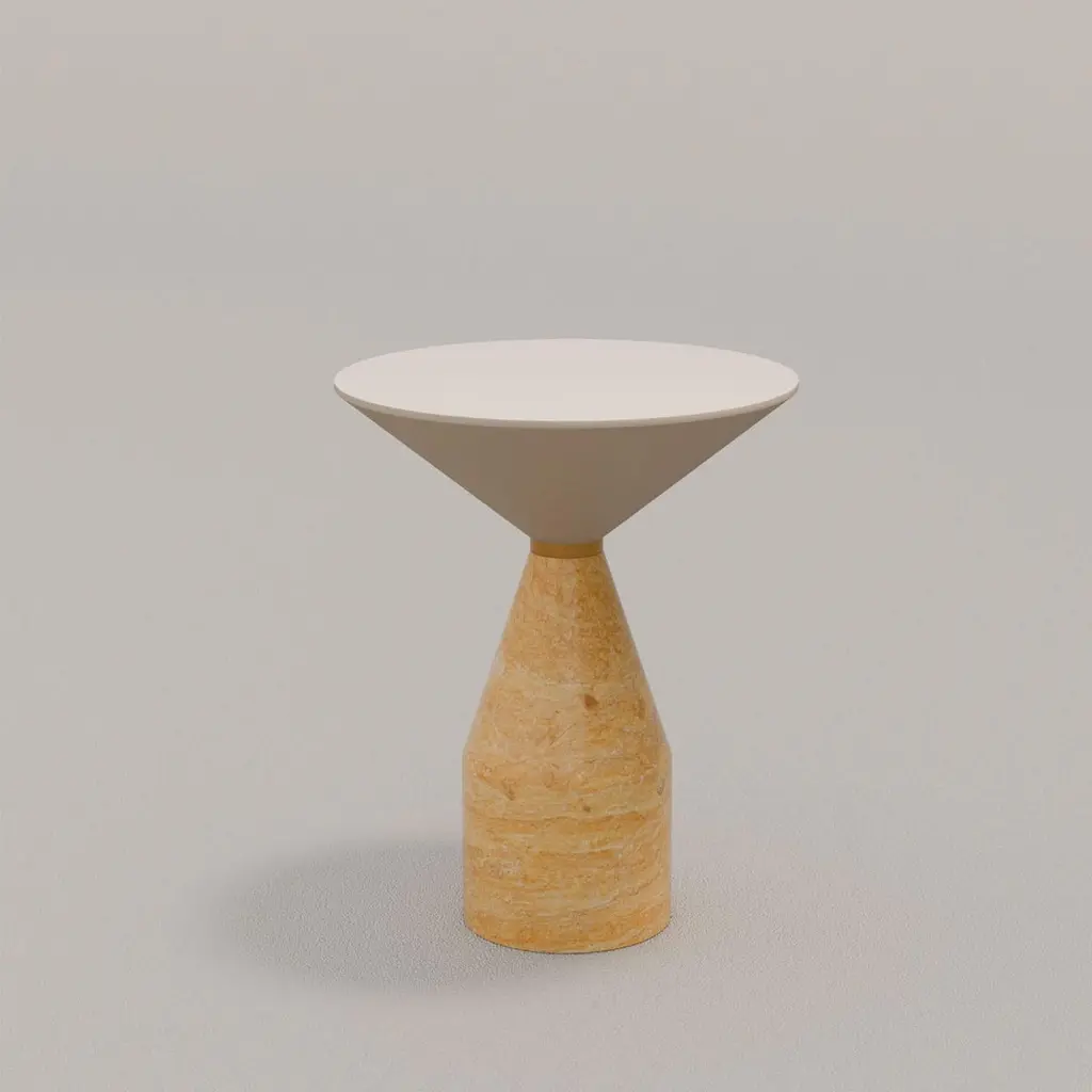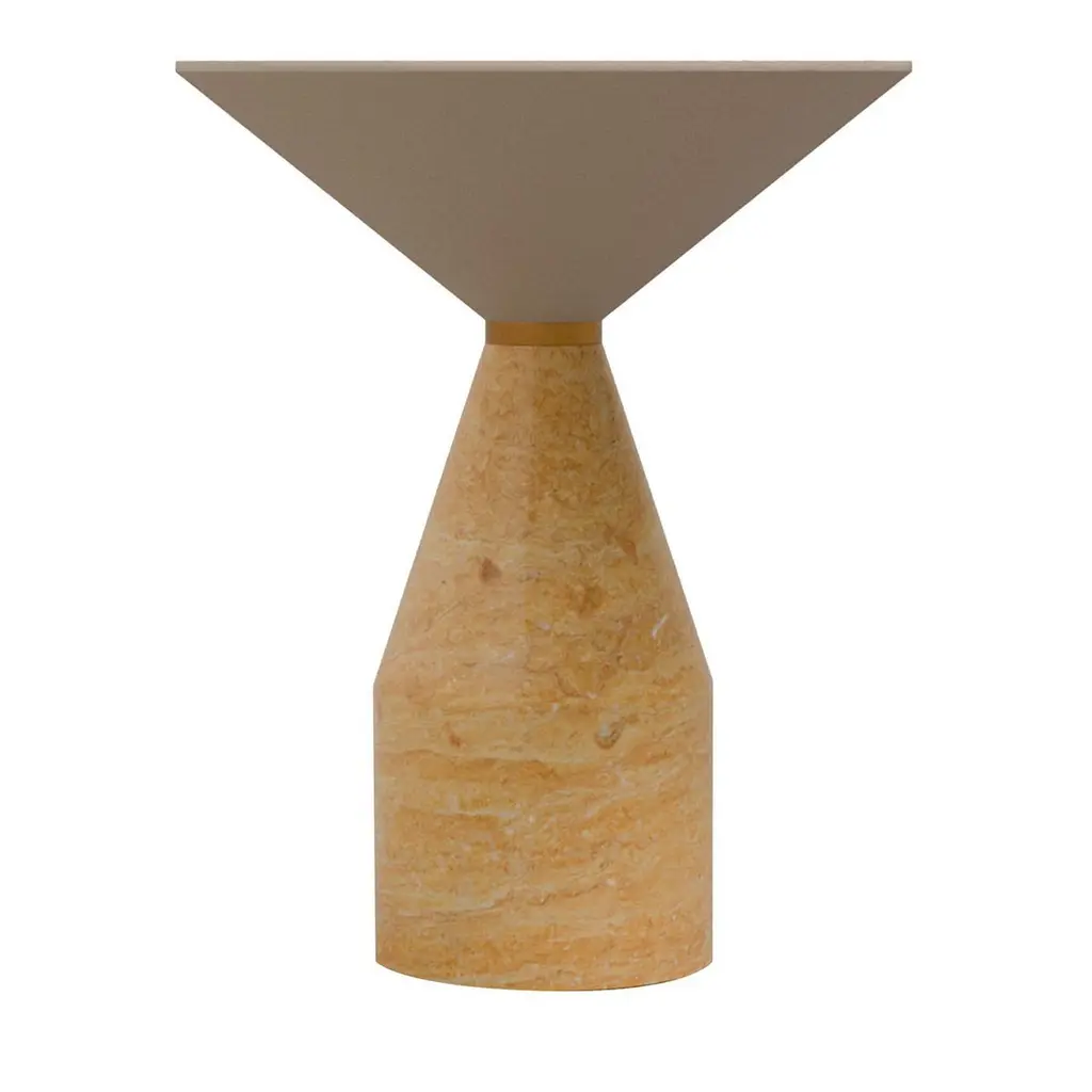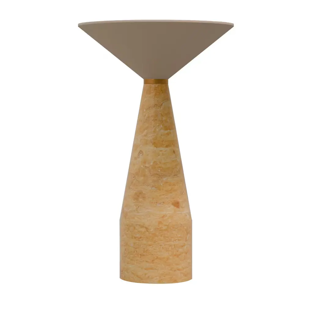 The Cino side table exemplifies a sophisticated fusion of artistry and functionality. This unique piece features a striking table top crafted from solid ash wood, elegantly complemented by a base made of luxurious yellow Reale marble. A distinct brass ring seamlessly unites the top and base, enhancing its sculptural form. This table stands as a statement piece, ideal for enriching contemporary living spaces. Its design reflects modern elegance while maintaining a timeless allure, making it a captivating focal point for any room. The raw materials used in the manufacturing process differ every time, consequently, there may be natural variations that are not to be considered flaws.