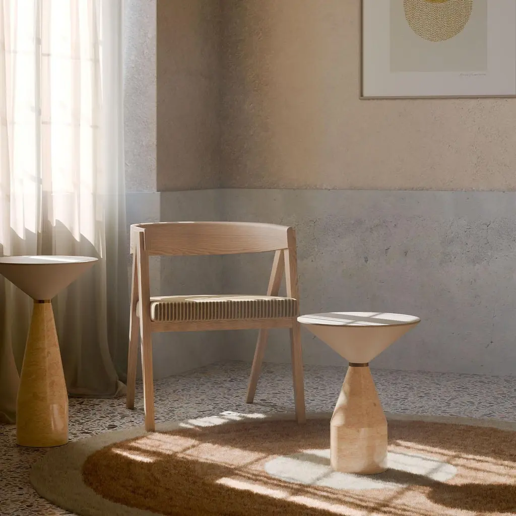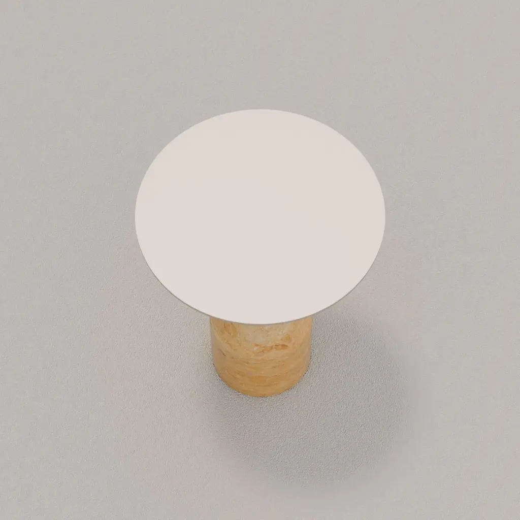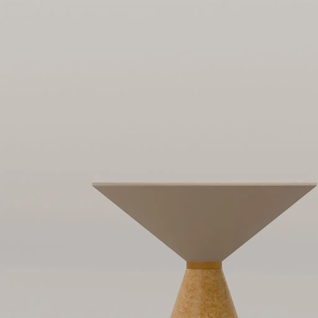 The Cino side table exemplifies a sophisticated fusion of artistry and functionality. This unique piece features a striking table top crafted from solid ash wood, elegantly complemented by a base made of luxurious yellow Reale marble. A distinct brass ring seamlessly unites the top and base, enhancing its sculptural form. This table stands as a statement piece, ideal for enriching contemporary living spaces. Its design reflects modern elegance while maintaining a timeless allure, making it a captivating focal point for any room. The raw materials used in the manufacturing process differ every time, consequently, there may be natural variations that are not to be considered flaws.