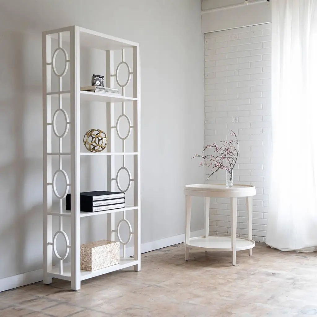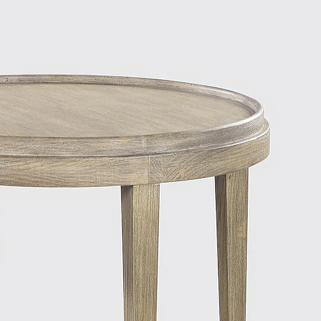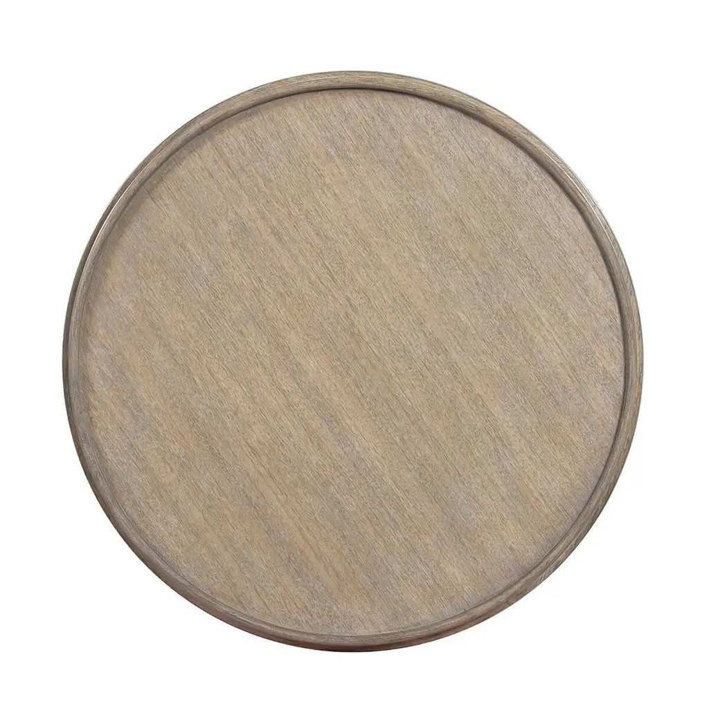 A Classic style round end table with a rustic and slightly distressed greyed painted finish showing slight grain accents in Celtic veneer. The two-tier side table with a wooden galleried dish top, with square tapered legs and a round shelf stretcher base.Dimensions: 24" W x 24" D x 24" H.