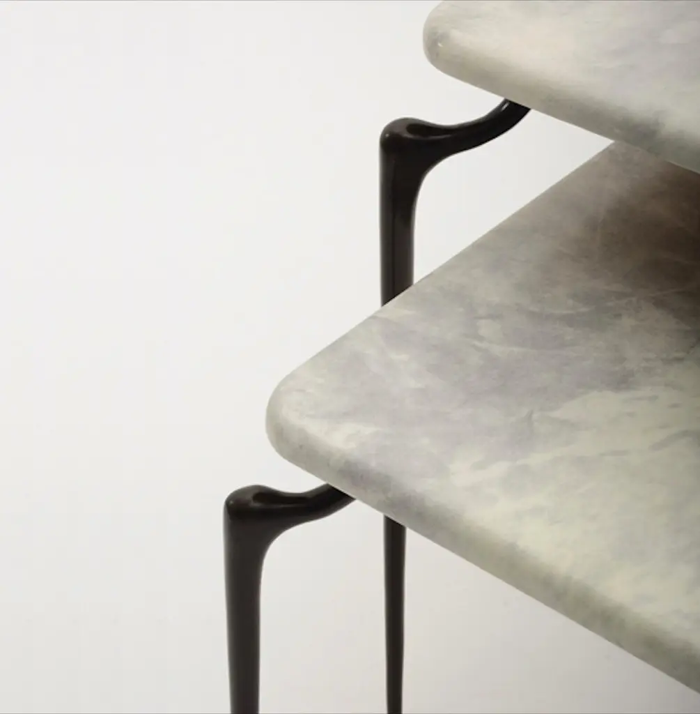 The Dojo side table is an elegant shape inspired by sculptural forms from artists such as Louise Bourgeois. Legs are made from cast bronze using the lost wax technique and the top is dyed parchment (goatskin). Custom sizes and finishes are available.