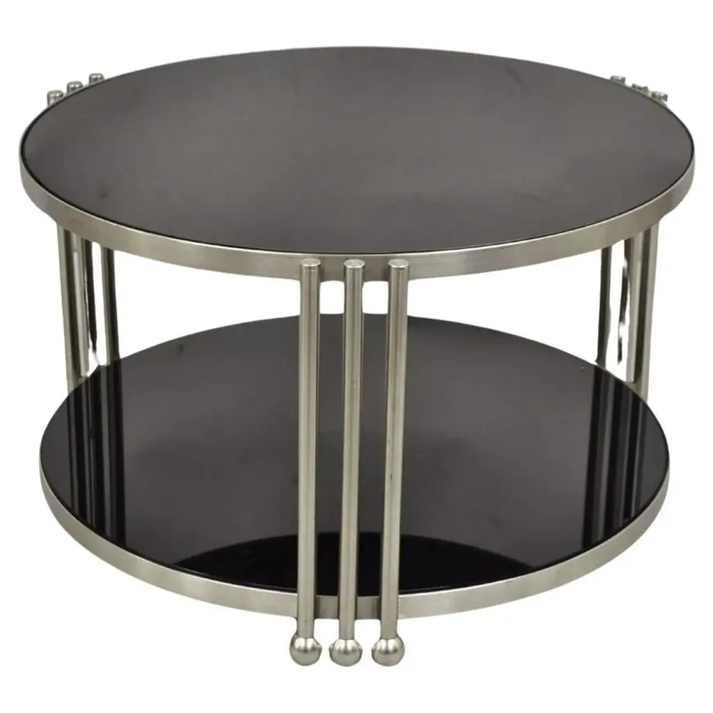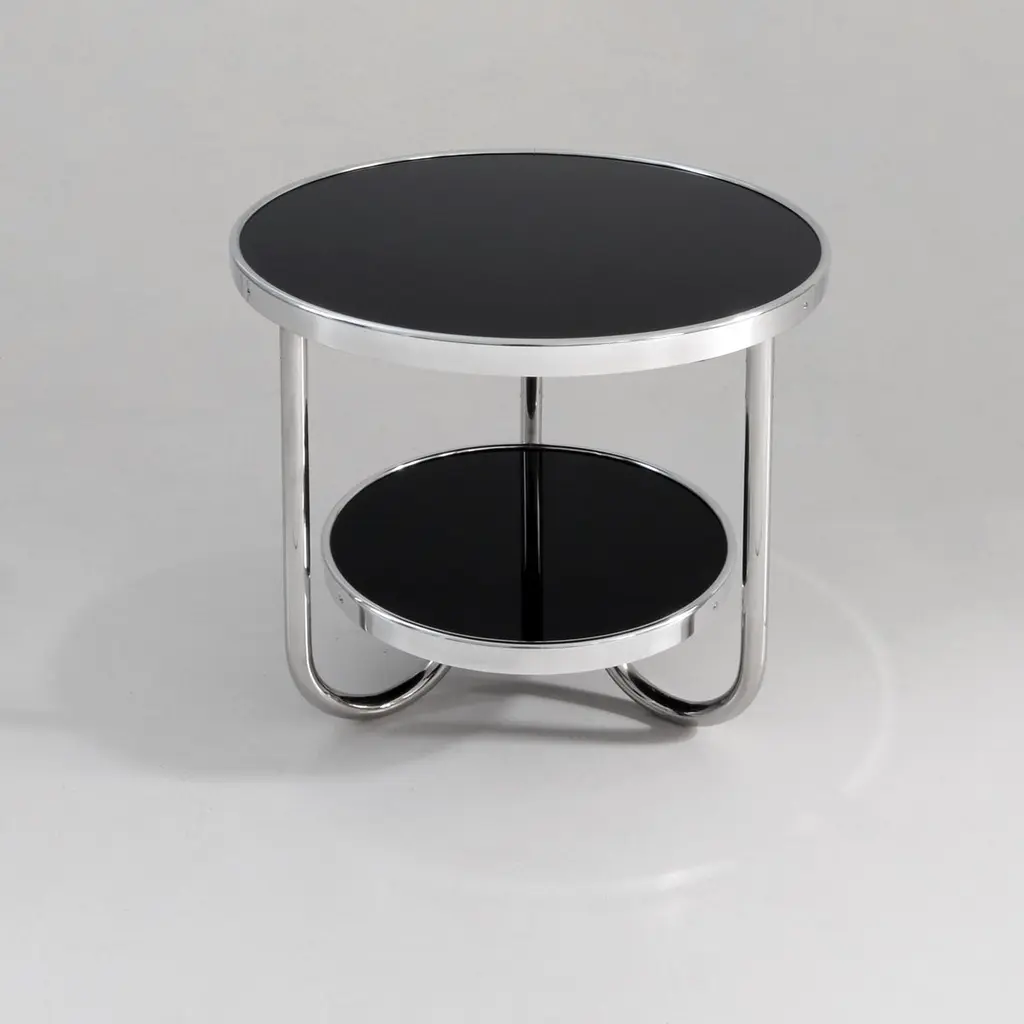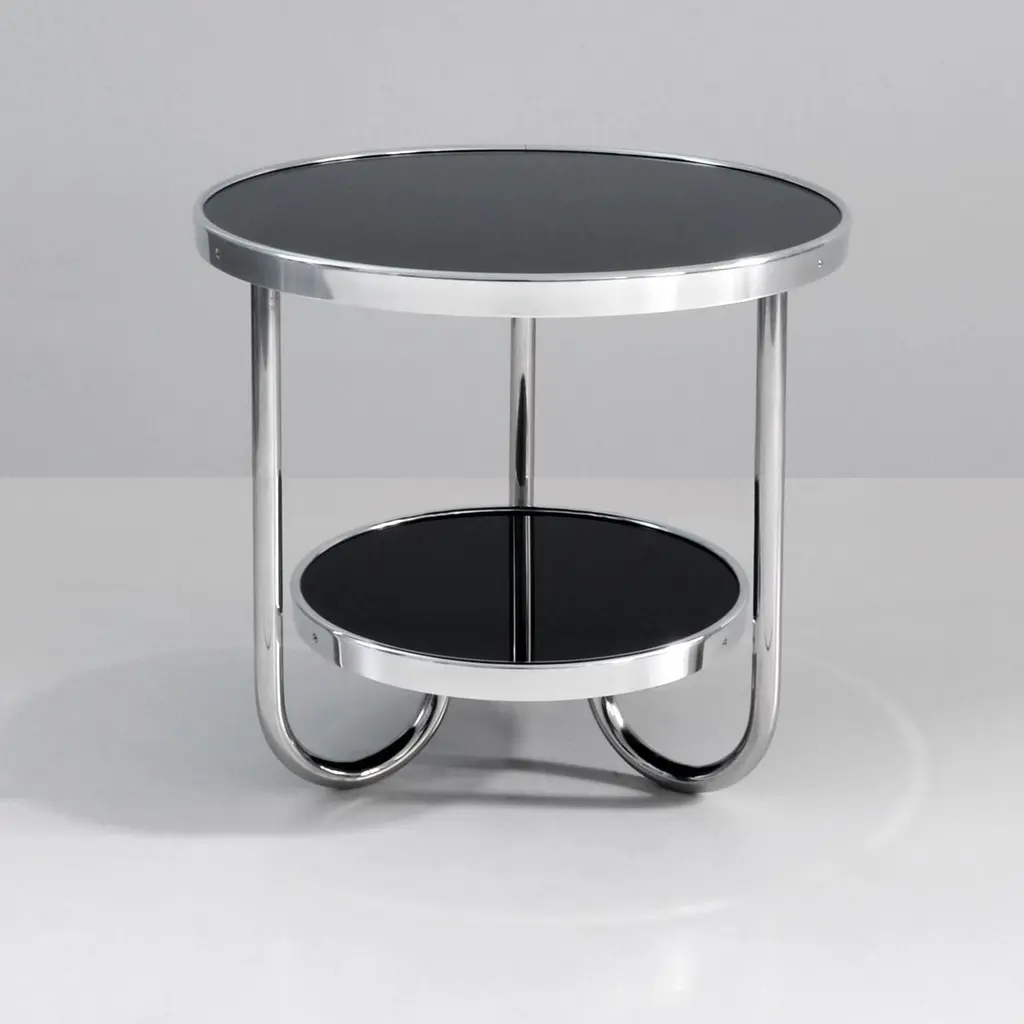 Small modernist round side table made of chromium-plated tubular steel and glass tops with aluminum profiles, customizable.