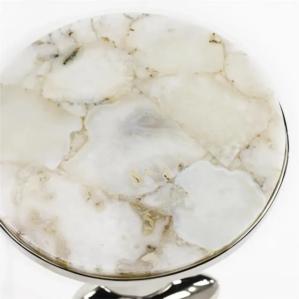 The Smelted Martini Table is a creative accent piece, evoking the unique look of molten metal. Crafted from aluminum and brass in a Polished Nickel finish, the table is constructed from three asymmetric shapes supporting a beautiful tabletop of white agate. Motifs of flowing metal contrasted against the clean cuts of the natural stone create a stunning focal point in any interior space.