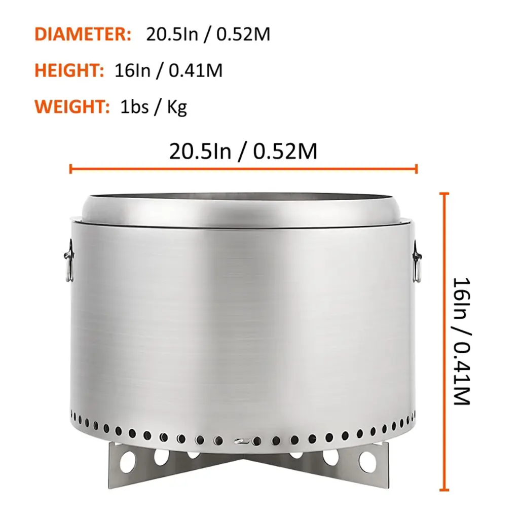 SPECIFICATION:Item Dimensions: 20.5"D x 20.5"W x 11.5"HDiameter: 20.5InchMaterial: Stainless SteelShape: RoundFuel Type: Wood PACKING LIST:Smokeless fire pit 1User guide1