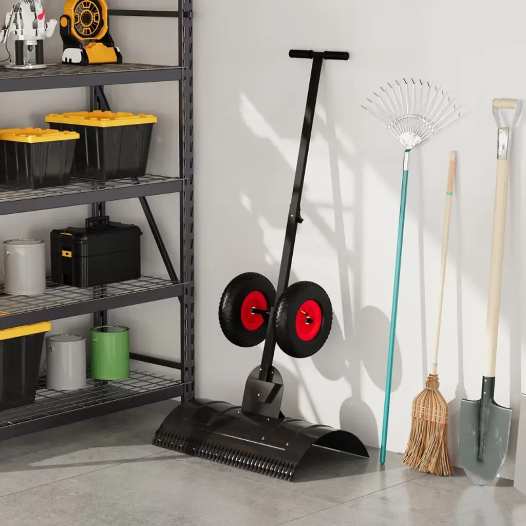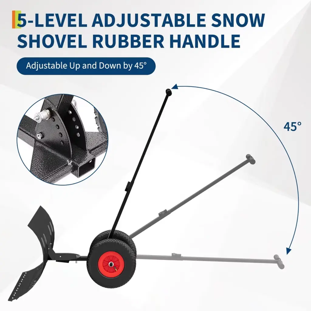 Snow Pusher Shovel With Wheels, Metal Back Saver Snow Plow For Doorway & Sidewalk, Snow Pusher With Snow Removal Adjustable Height Handle, 15"h