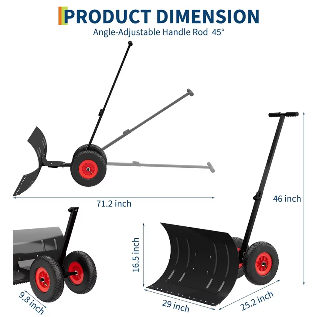 Snow Pusher Shovel With Wheels, Metal Back Saver Snow Plow For Doorway & Sidewalk, Snow Pusher With Snow Removal Adjustable Height Handle, 18"h