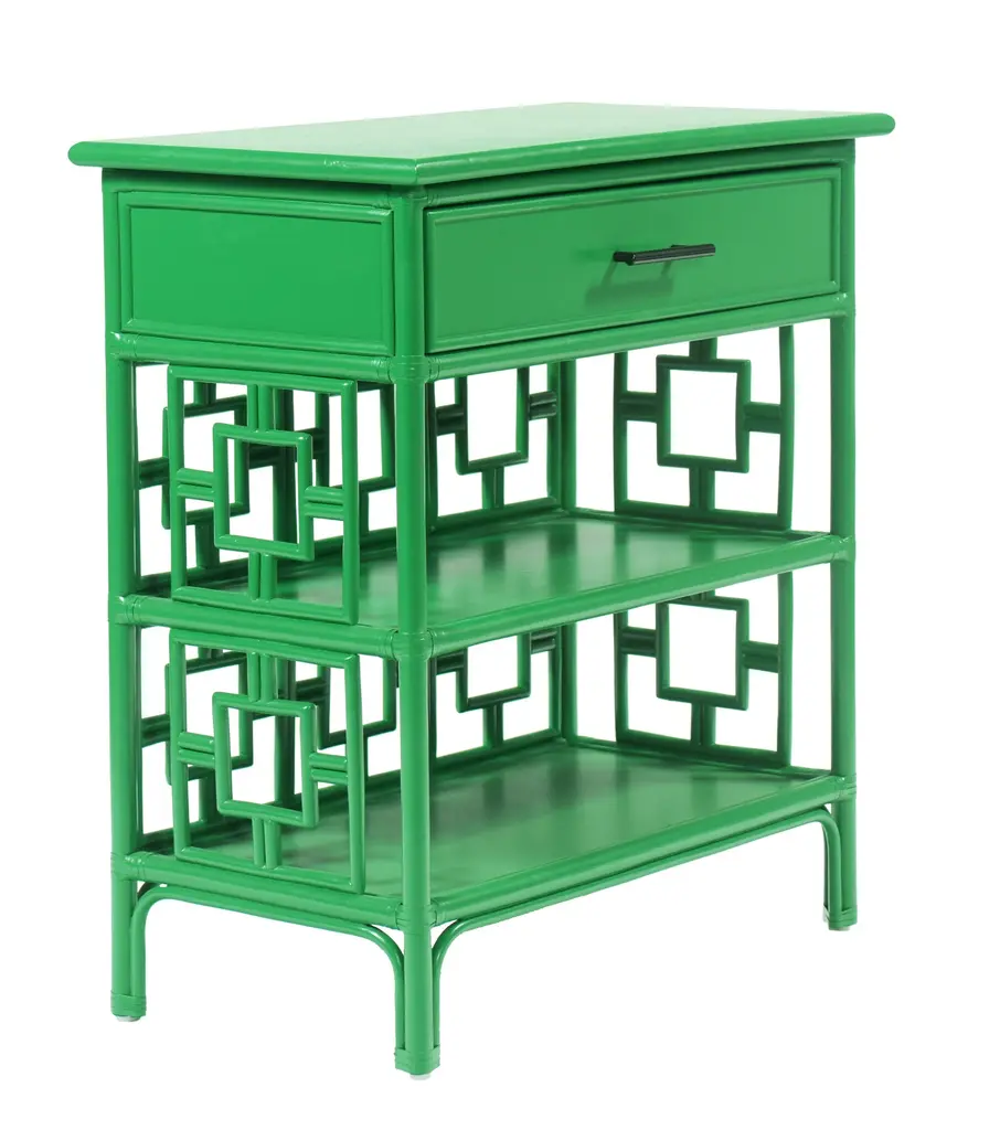 Classically styled, this end table features a Rattan frame with rawhide bindings. The intricate rattan detail is hand applied. The table features one drawer with full extionsion metal drawer glides and two wooden shelves to provide a great deal of storage space. This table has multiple functions and could be used as a bed side table, a dining buffet or perfect for a small entryway. Each end table is hand painted to order in the USA. Please allow time for delivery.