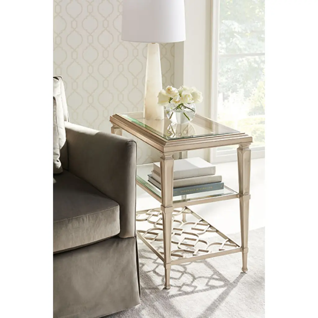Make friends with a side table that successfully inserts itself into almost any situation or decor setting. A matte metallic, Taupe Silver Leaf interacts nicely with light and dark wood finishes, other metals and upholstered fabric combinations. A glass top and mid-level glass shelf show off the table’s distinctive interconnecting patterned top and lower stretcher.