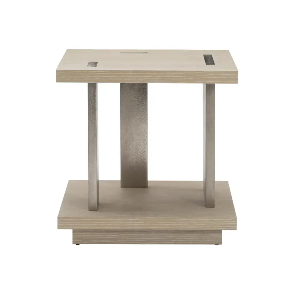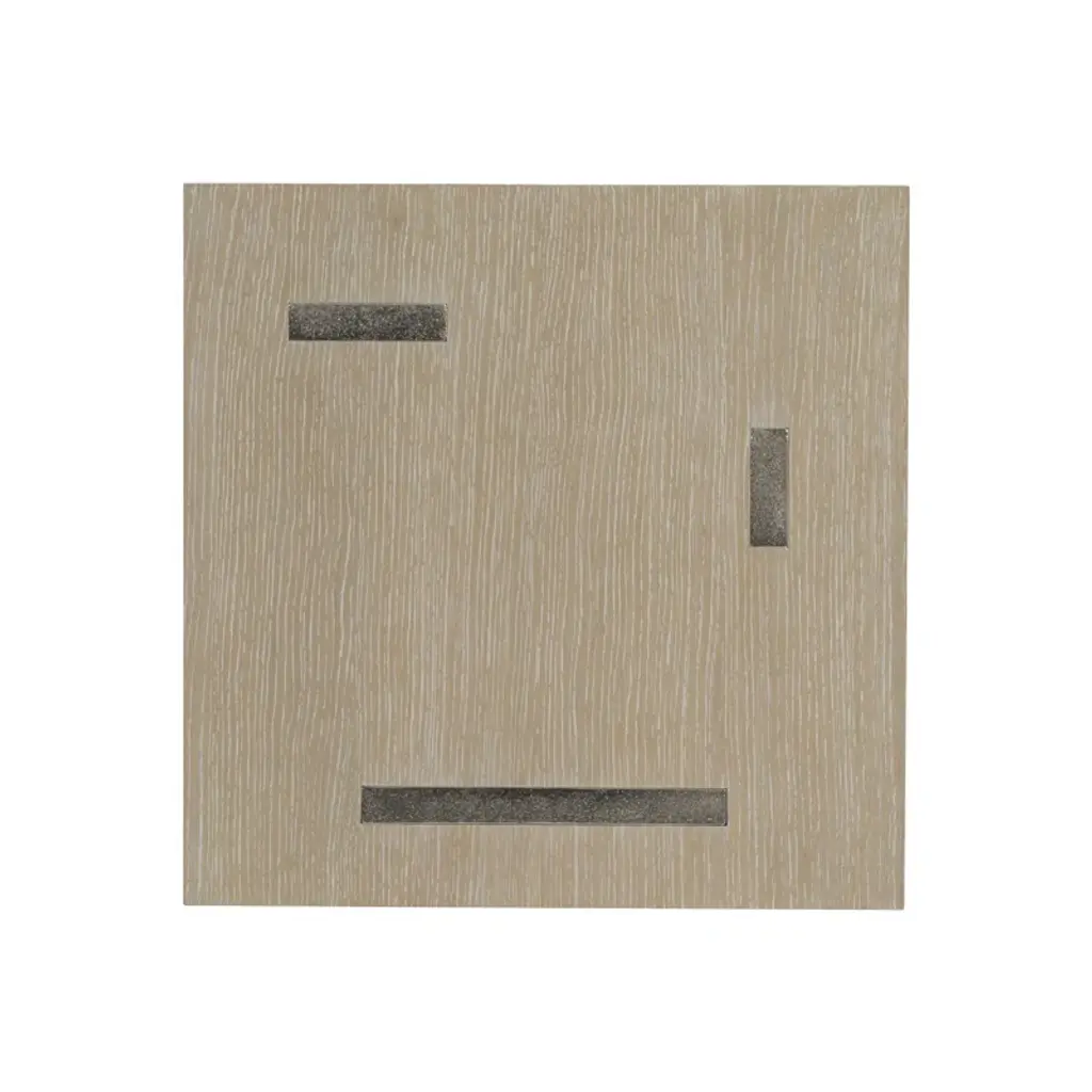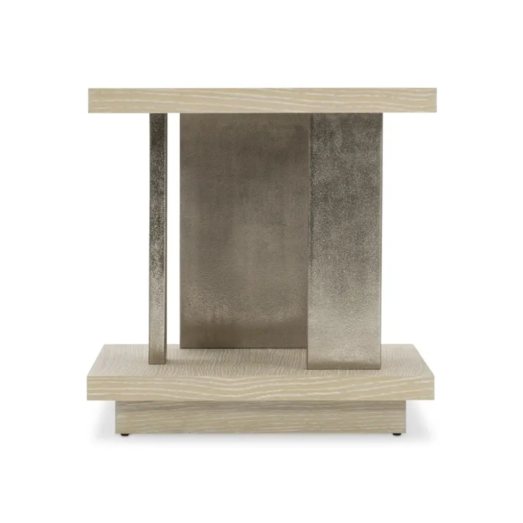 Cast aluminum panels in varying sizes create compelling supports for the Solaria side table. Resting on a plinth wooden base, the panels pierce the wooden top to create a stunning inset pattern on the tabletop. Quartered white oak veneers feature a Dune finish, while metal accents add shine.