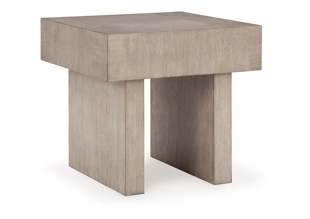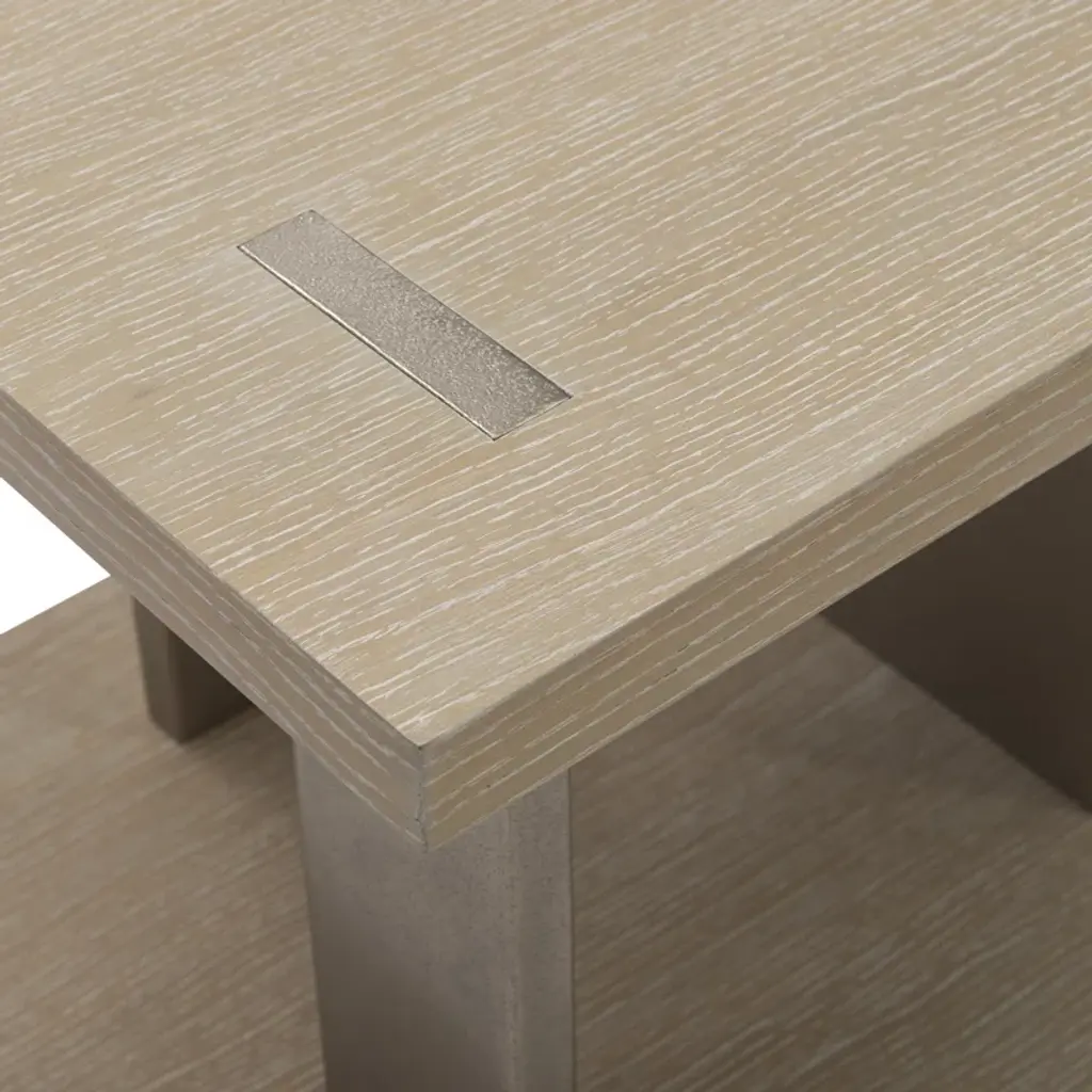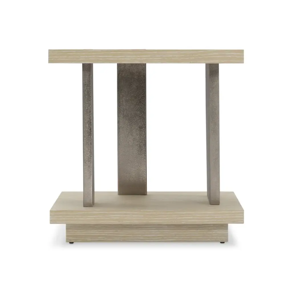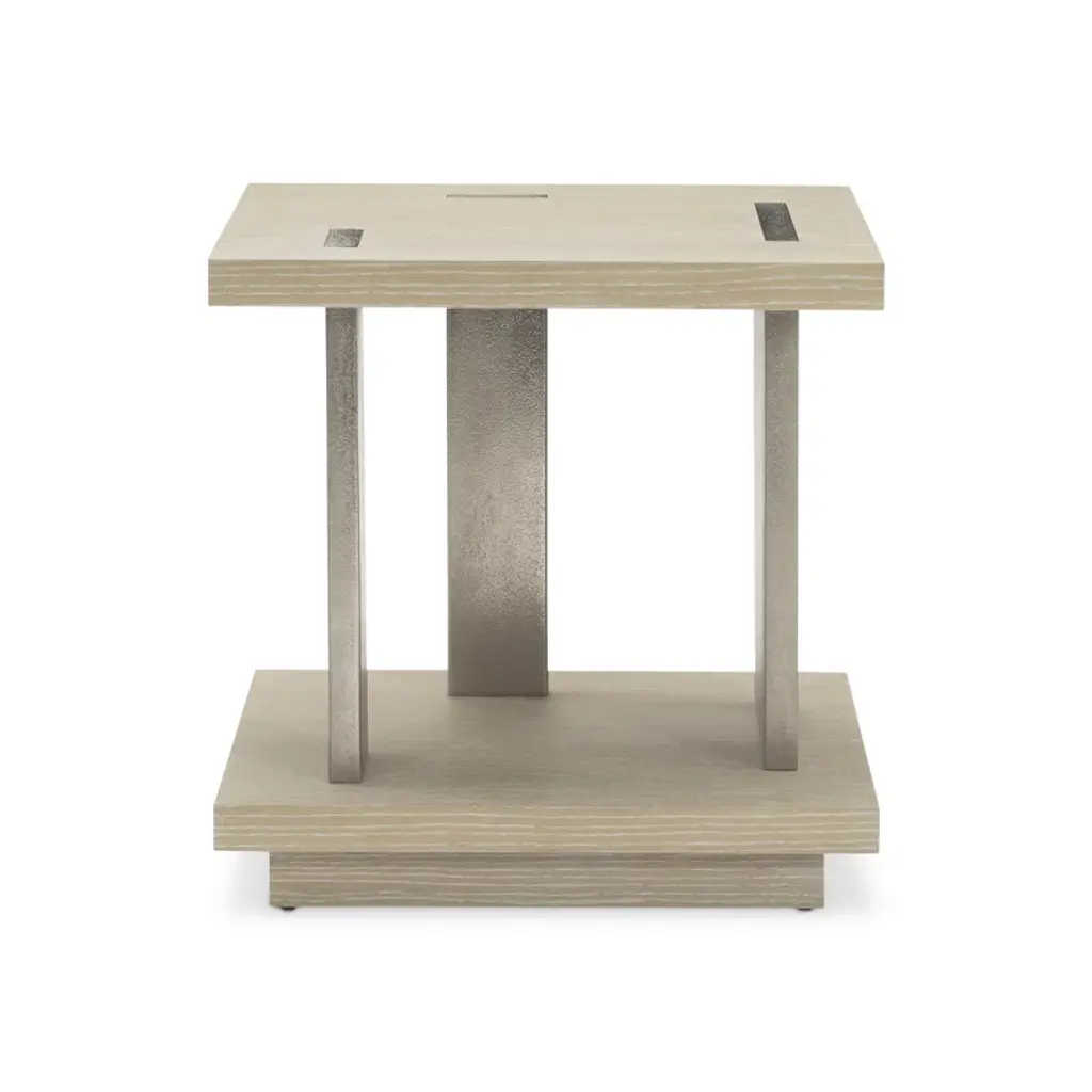 Cast aluminum panels in varying sizes create compelling supports for the Solaria side table. Resting on a plinth wooden base, the panels pierce the wooden top to create a stunning inset pattern on the tabletop. Quartered white oak veneers feature a Dune finish, while metal accents add shine.