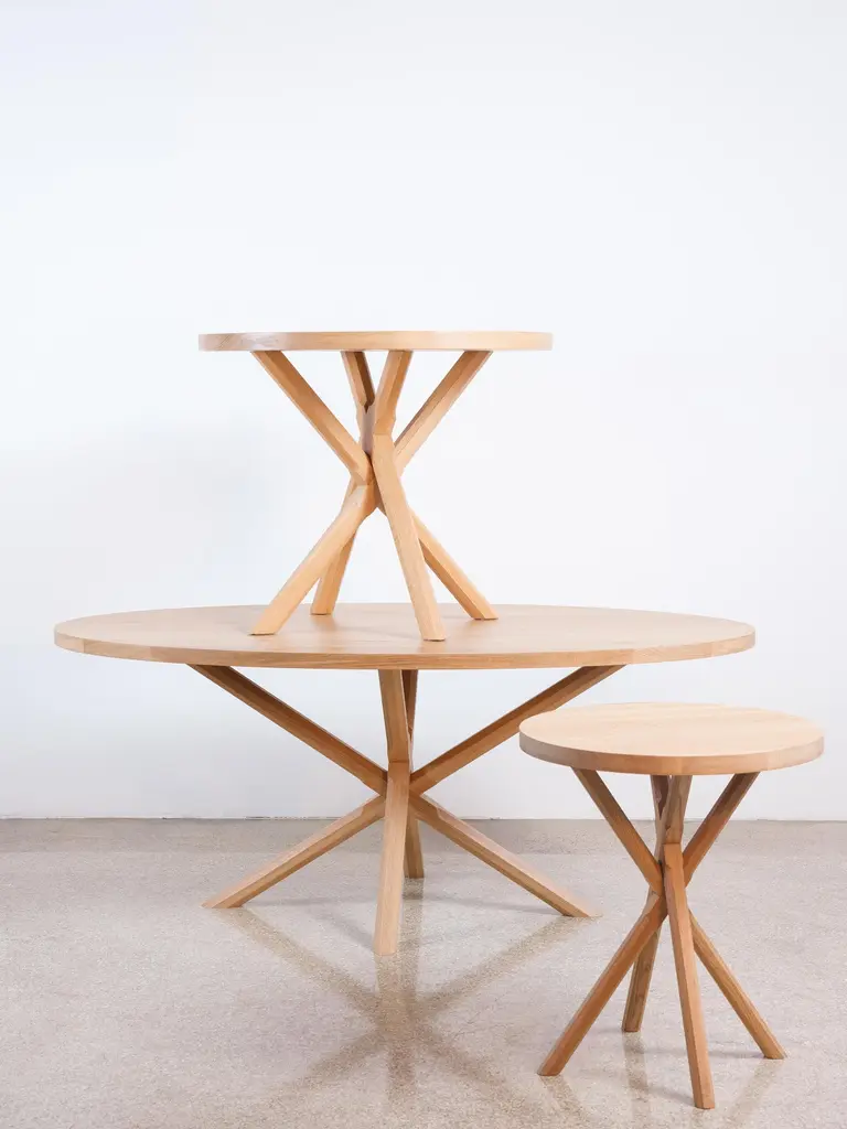 This modern x-based side table is hand made in the United States and features all-hardwood construction. Characterized by a thick solid wood top, and intricately carved polygonal legs, the modern Bond Side Table is distinguished by its dual X-shaped pedestal base. The larger base serves as the foundation, while the smaller base rests atop it, creating a tiered effect. This rustic X-base table can enhance a variety of design styles. This piece can be ordered in 4 finishes: Oak, Walnut, Ash, or an Ebonized finish.Bond Collection by Lynnea JeanThe Bond collection represents stability and place to gather. Tables are one of the most fundamental pieces of furniture; for centuries, people have assembled around them to nourish themselves, imbibe, and form bonds.Round and square variations are possible. The top can be exchanged for stone. Each piece is handmade using the finest quality solid wood in Downtown Los Angeles.Lynnea Jean offers complete custom capabilities to the trade. To inquire, specify the dimensions, select the finish and consider adapting the design details to your specific needs.