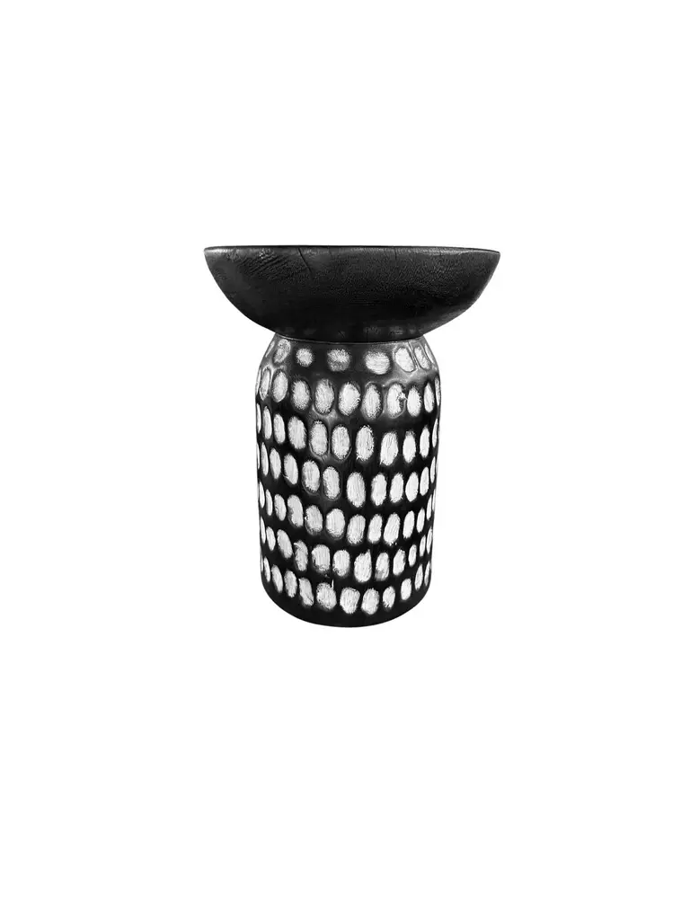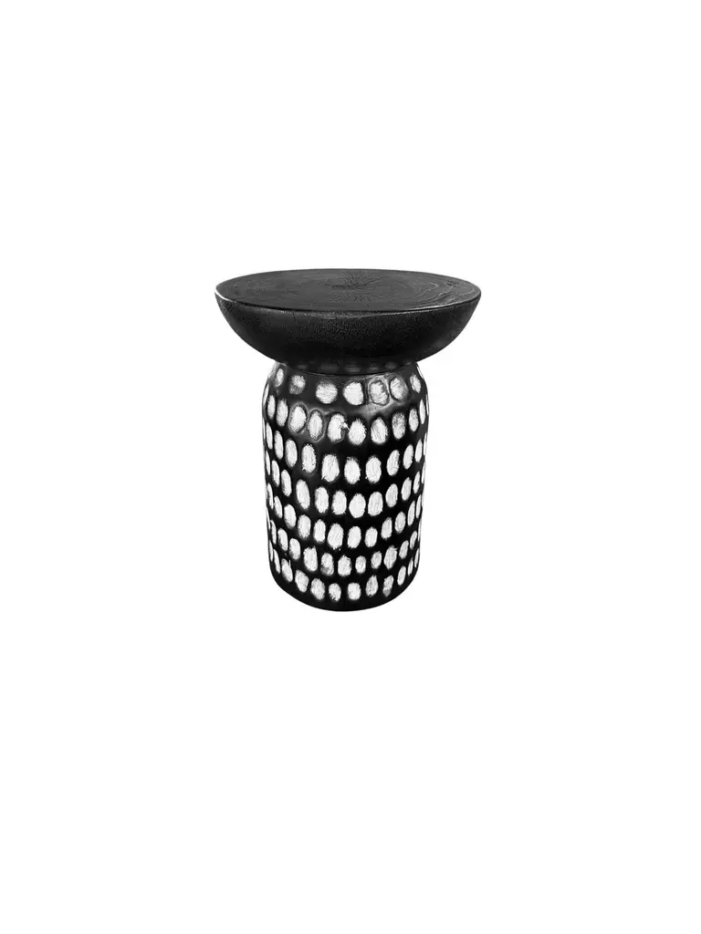 A wonderfully sculptural round side table, with an hourglass shape. Its neutral pigments make it perfect for any space. A uniquely sculptural and versatile piece certain to invoke conversation. It was crafted from a solid block of mango wood and has a smooth texture finish. The wood texture present on all sides adds to its charm. This bench features hand carved detailing at its base which have also been painted white to add a unique texture.