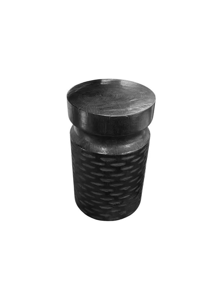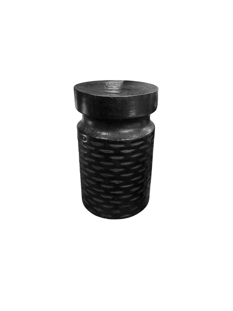 A wonderfully sculptural round side table, with an hourglass shape. Its neutral pigments make it perfect for any space. A uniquely sculptural and versatile piece certain to invoke conversation. It was crafted from a solid block of mango wood and has a smooth texture finish. The wood texture present on all sides adds to its charm.