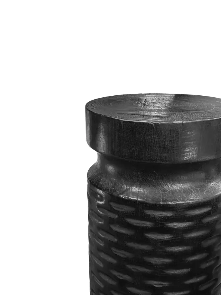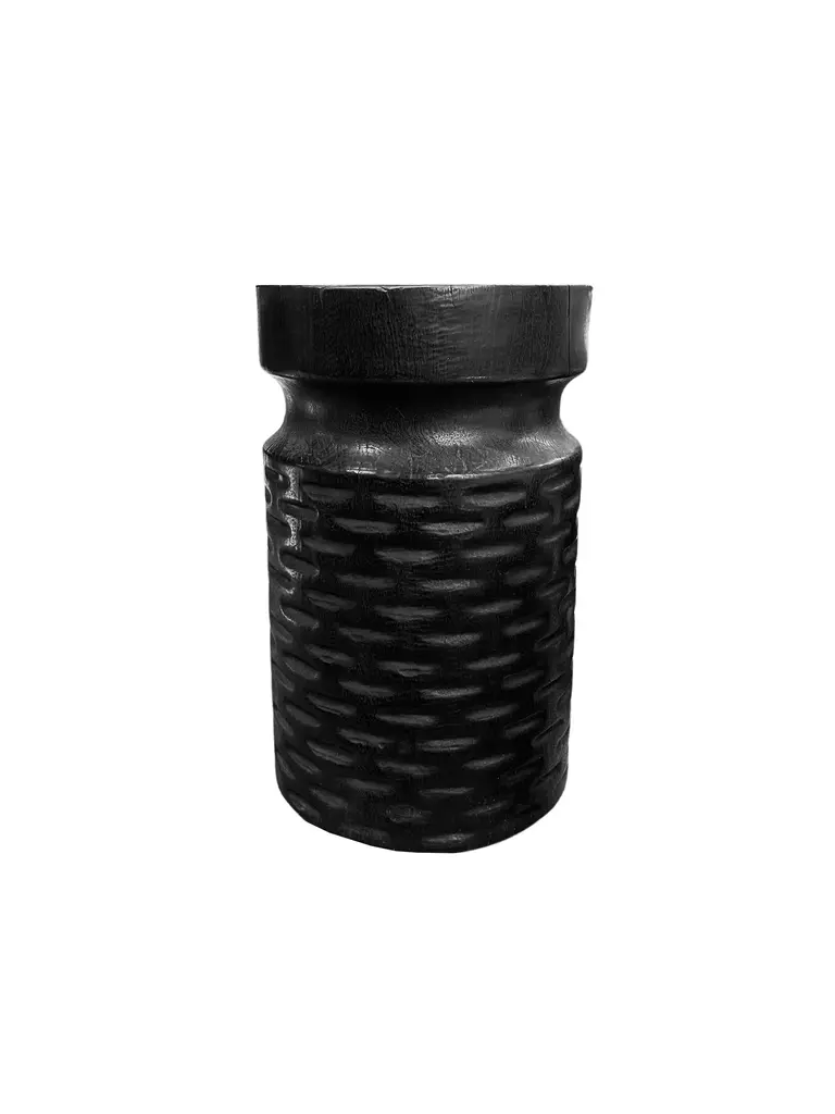 A wonderfully sculptural round side table, with an hourglass shape. Its neutral pigments make it perfect for any space. A uniquely sculptural and versatile piece certain to invoke conversation. It was crafted from a solid block of mango wood and has a smooth texture finish. The wood texture present on all sides adds to its charm.