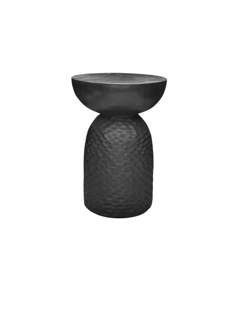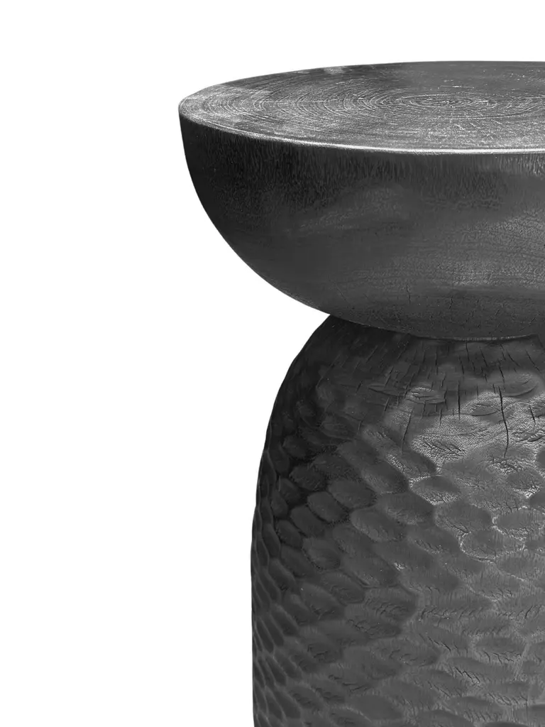 A wonderfully sculptural round side table, with an hourglass shape. Its neutral pigments make it perfect for any space. A uniquely sculptural and versatile piece certain to invoke conversation. It was crafted from a solid block of mango wood and has a smooth texture finish. The wood texture present on all sides adds to its charm.