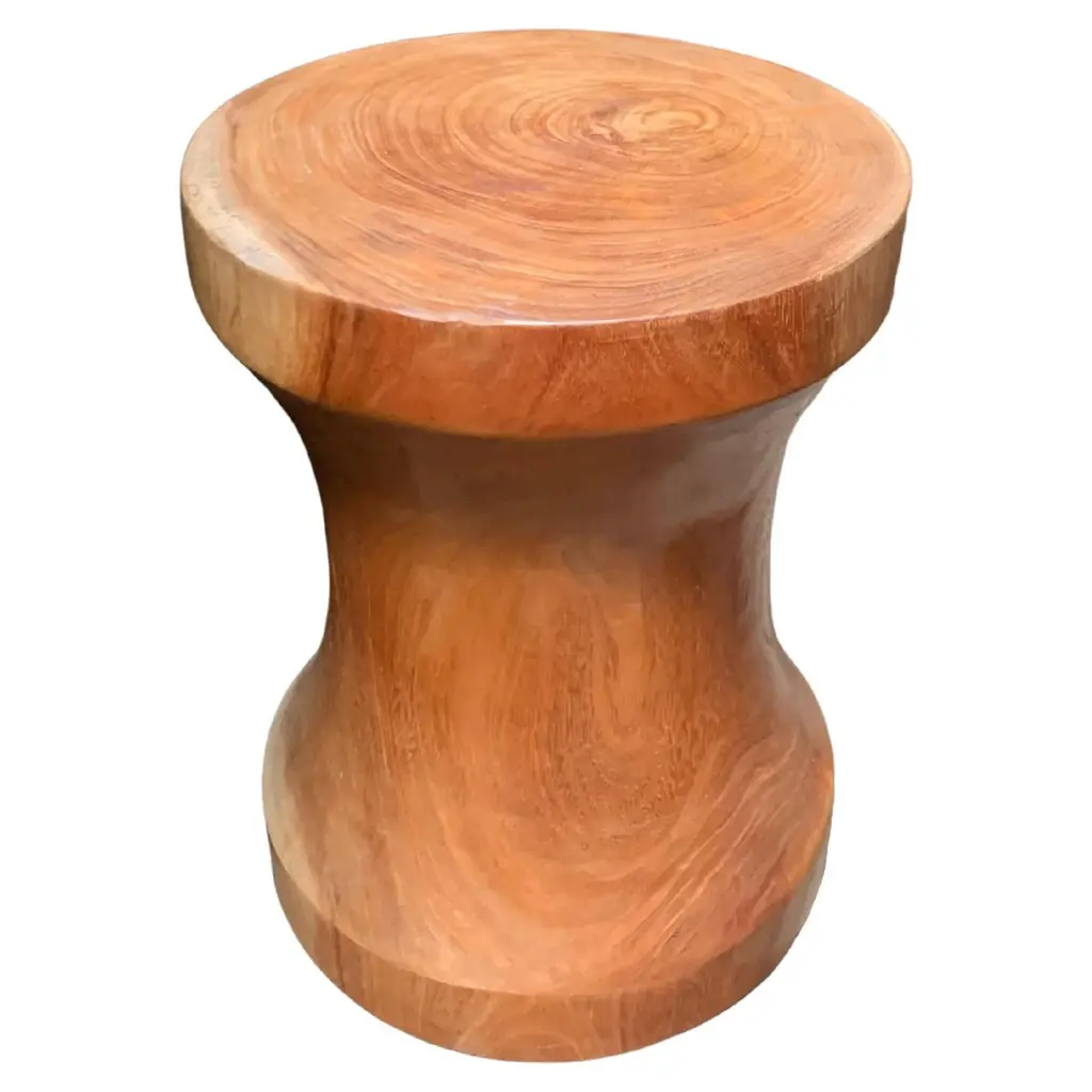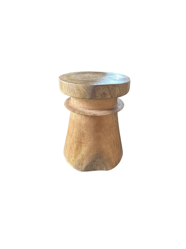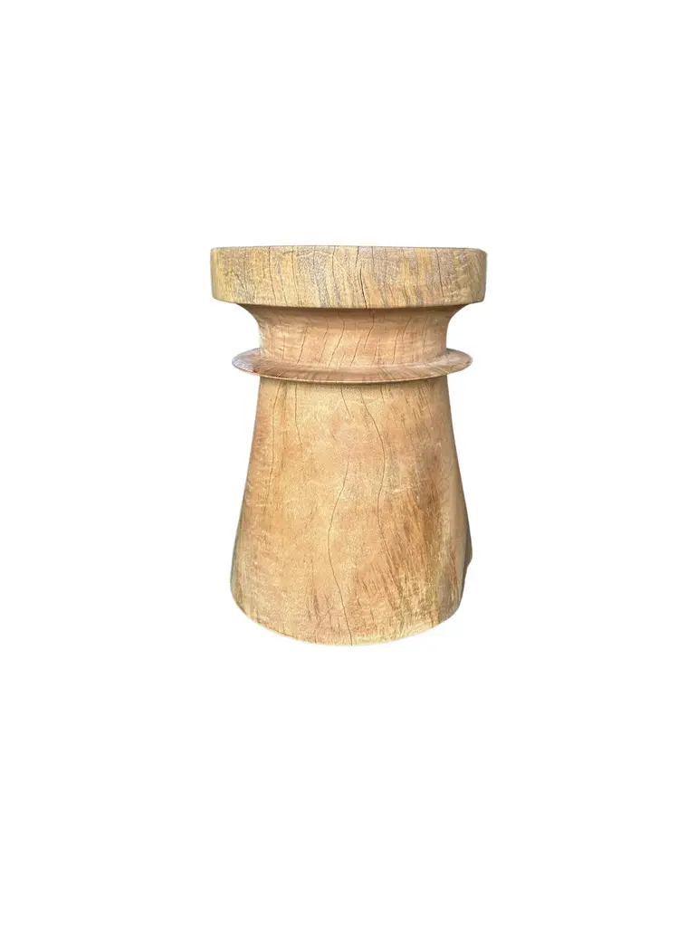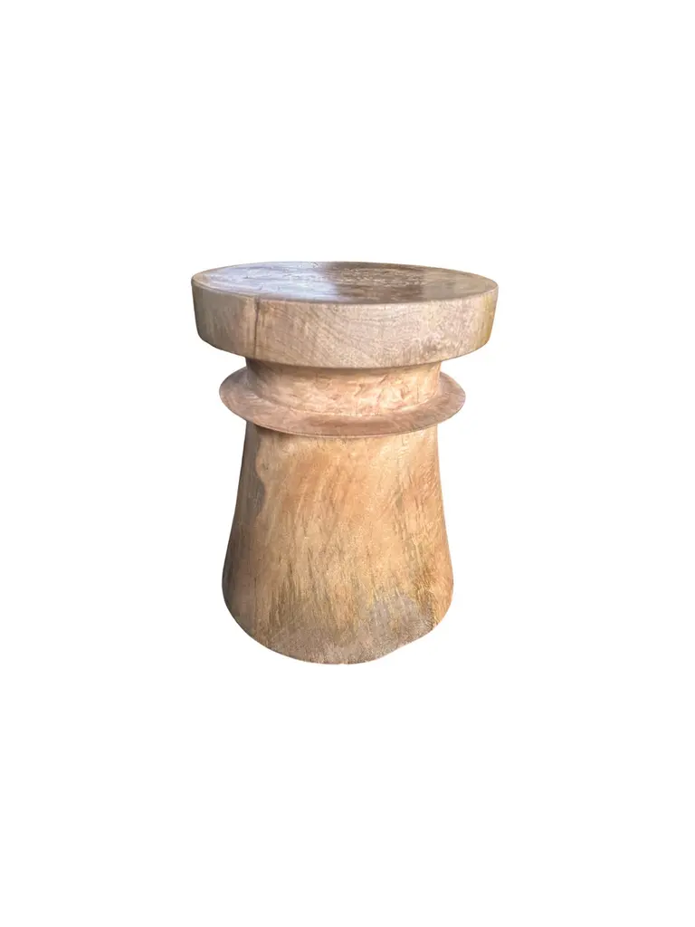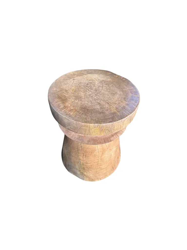 A wonderfully sculptural round side table. Its neutral pigments make it perfect for any space. A uniquely sculptural and versatile piece certain to invoke conversation. It was crafted from a solid block of mango wood and has a smooth texture natural finish. To achieve its finish the wood was meticulously sanded down then coated with clear finish. The wood texture present on all sides adds to its charm. .