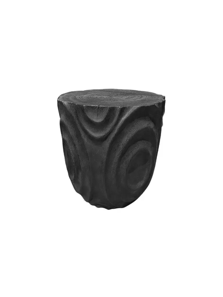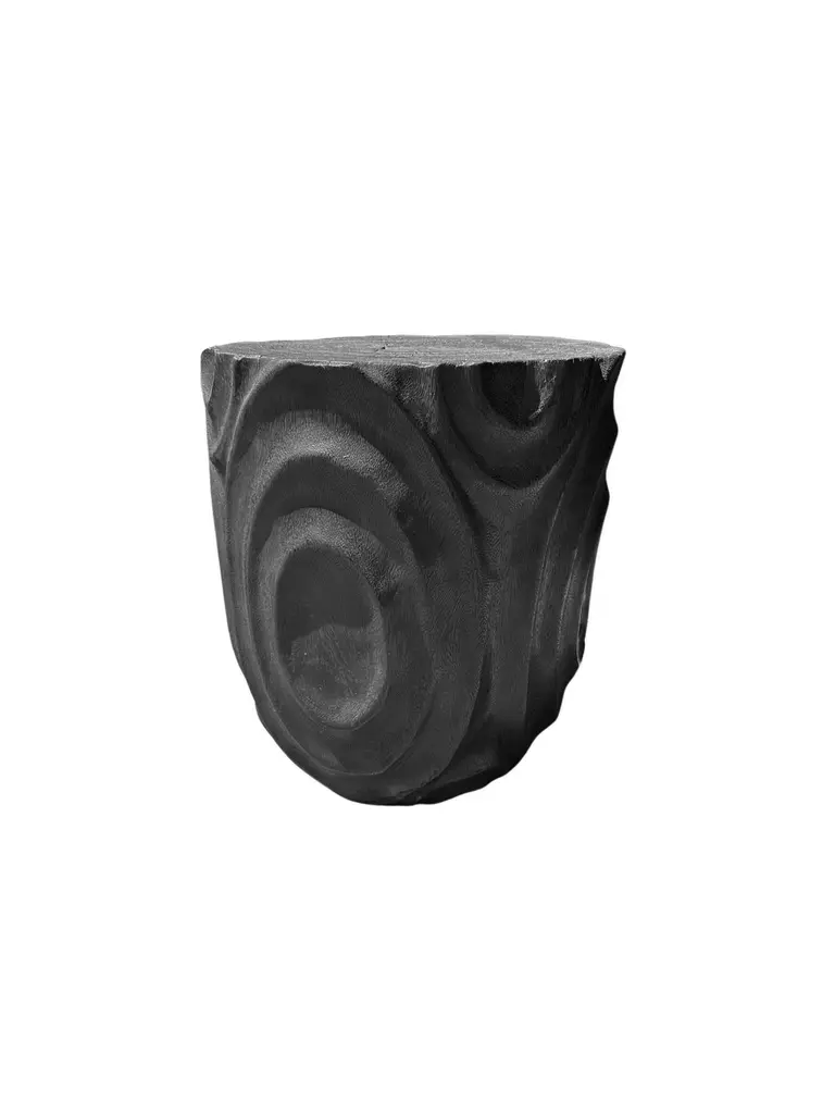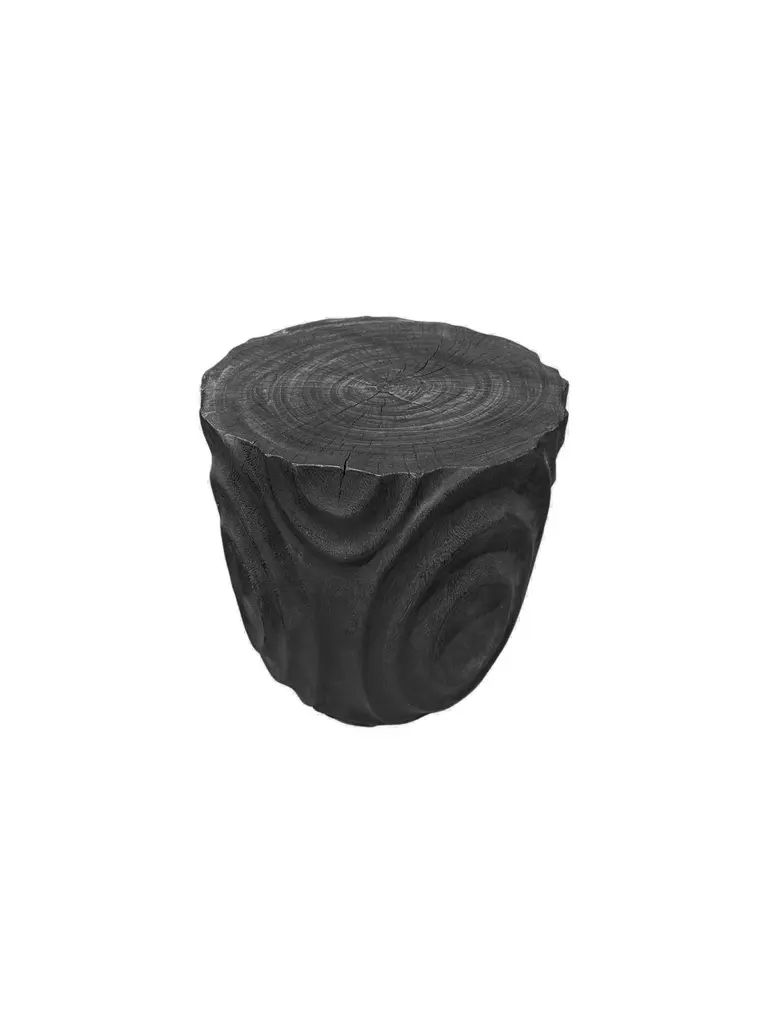 A wonderfully sculptural round side table. Its neutral pigments make it perfect for any space. It was crafted from a solid block of mango wood and features carved detailing on its sides. To achieve is black color the wood was burnt three times and then coated with clear finish. The wood texture present on all sides adds to its charm.