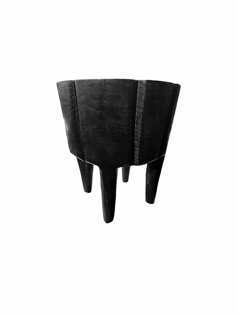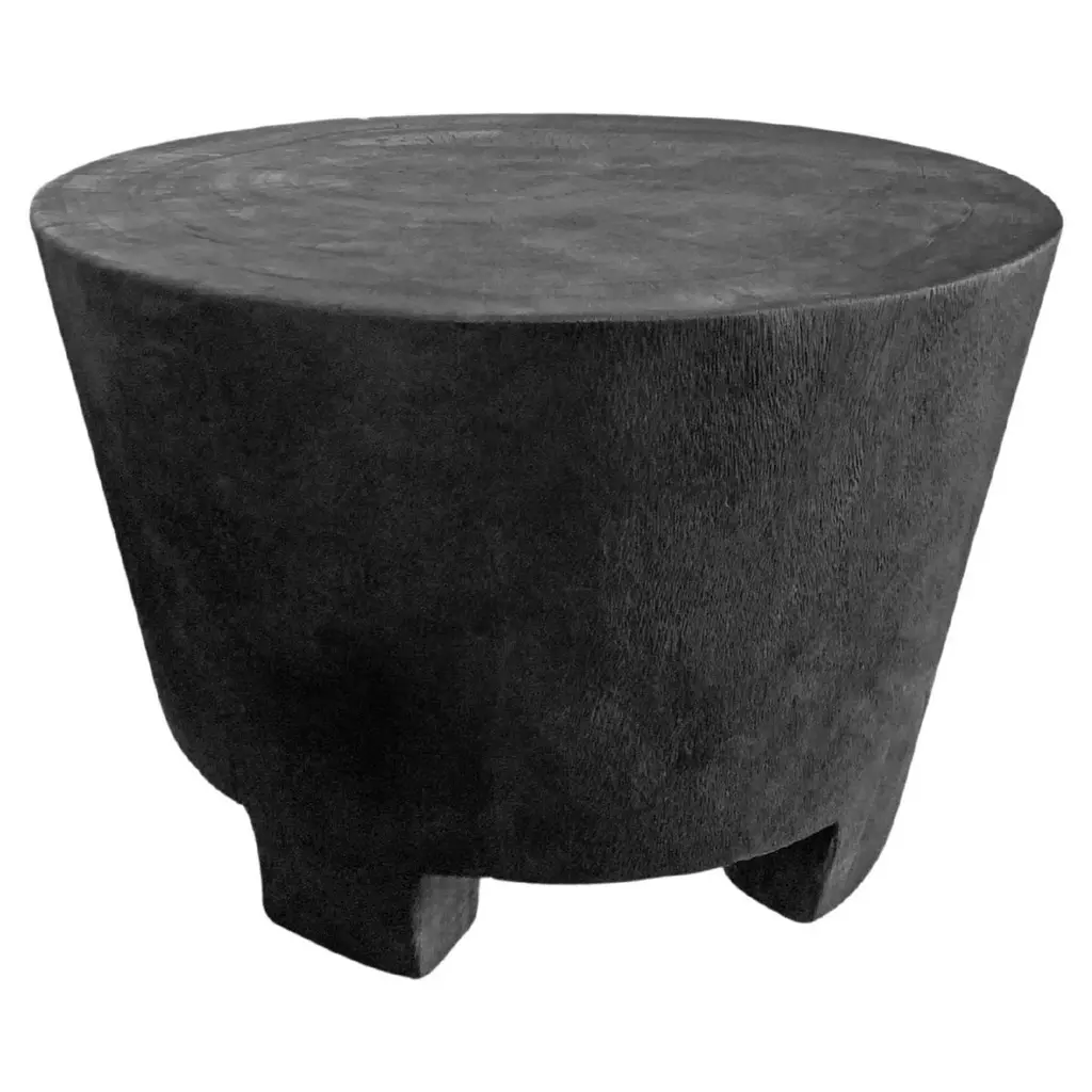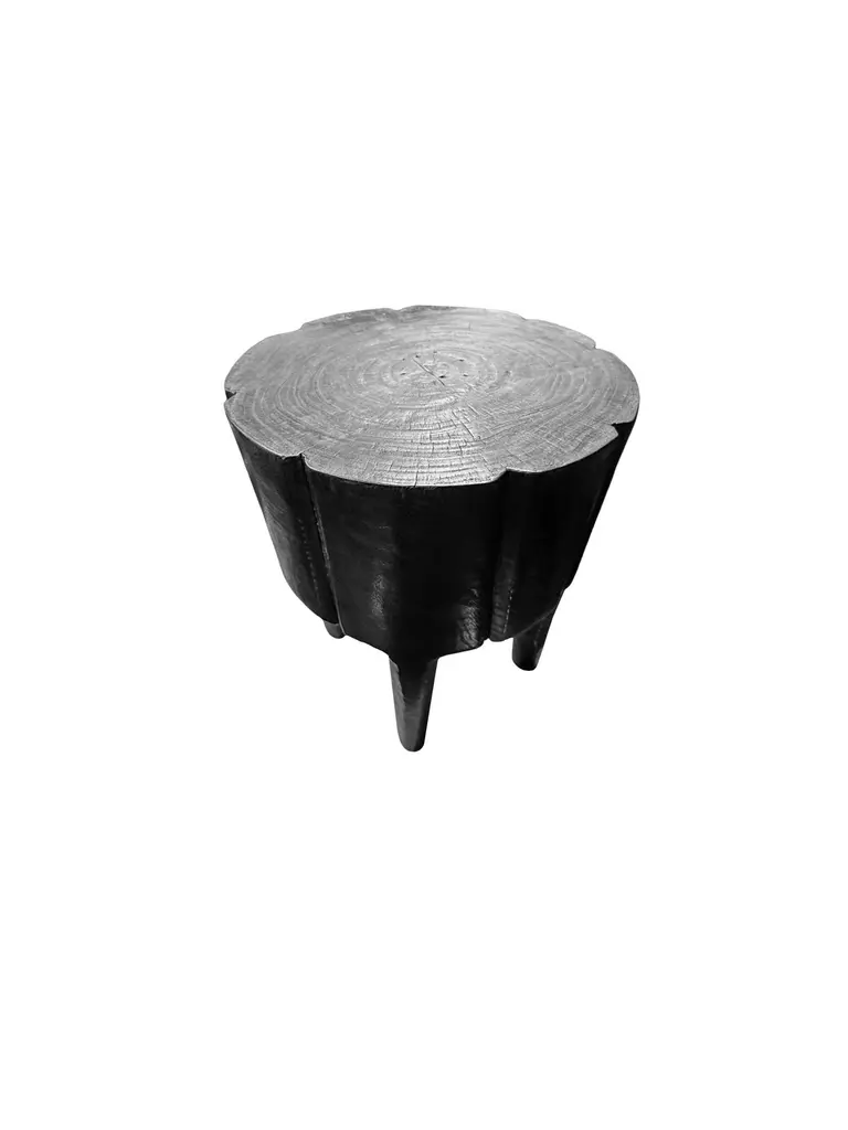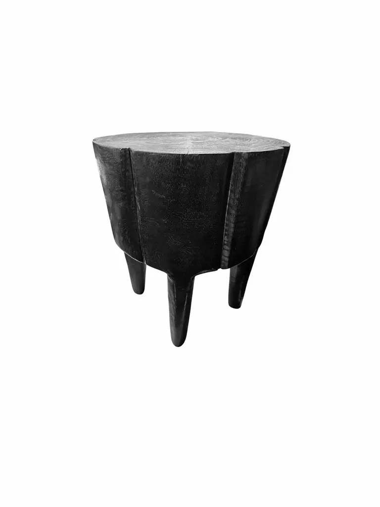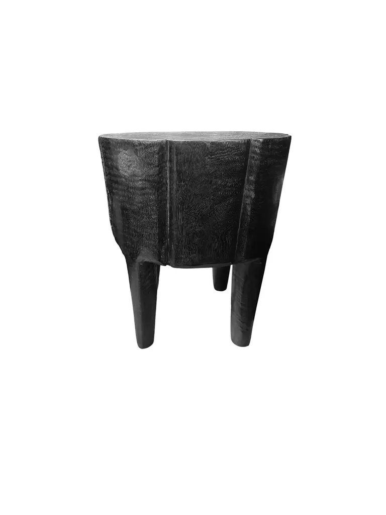 A wonderfully sculptural round side table. Its neutral pigments make it perfect for any space. It was crafted from a solid block of mango wood and features subtle carved detailing on its side as well as slender legs. To achieve its black color the wood was burnt three times and then coated with clear finish. The wood texture present on all sides adds to its charm.