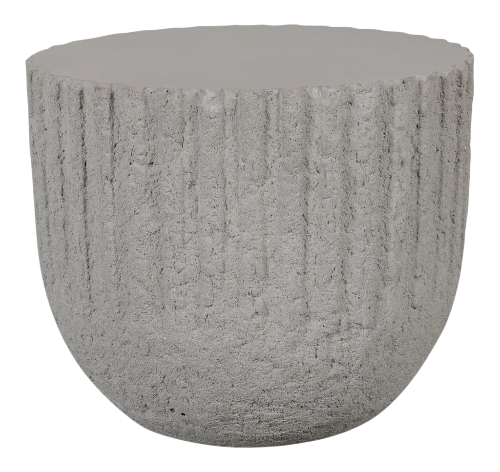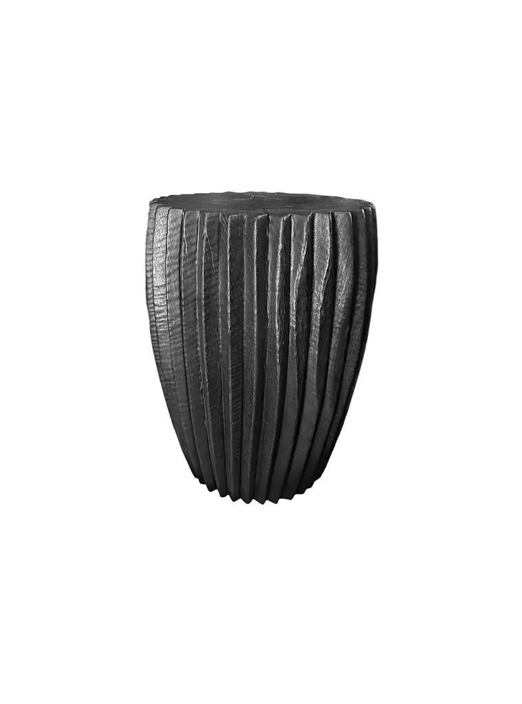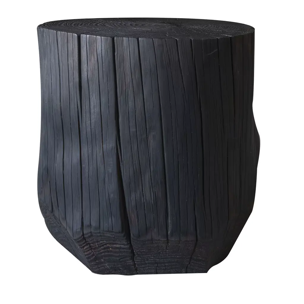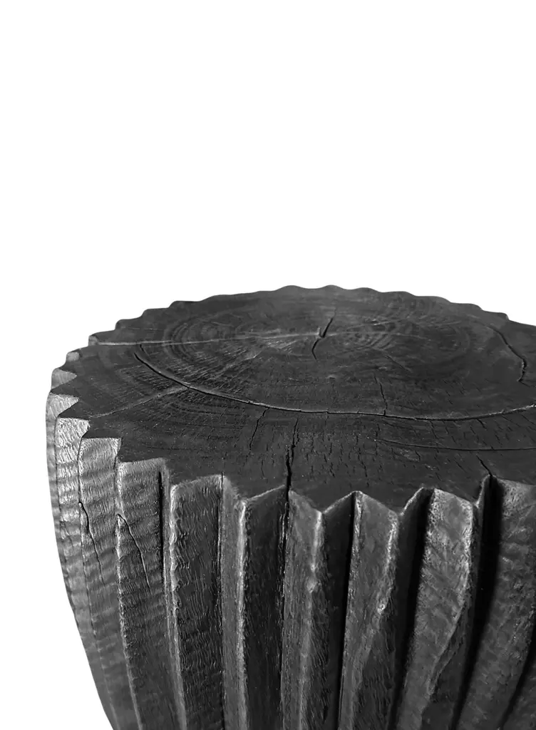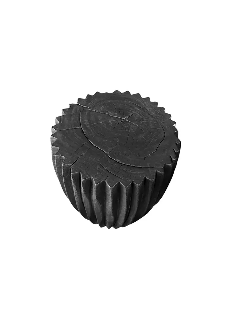 A wonderfully sculptural round side table. Its neutral pigments make it perfect for any space. It was crafted from a solid block of mango wood and features carved detailing on its sides. To achieve is black color the wood was burnt three times and then coated with clear finish. The wood texture present on all sides adds to its charm.
