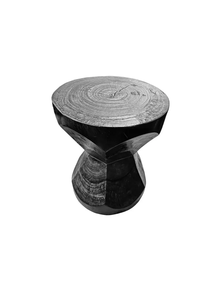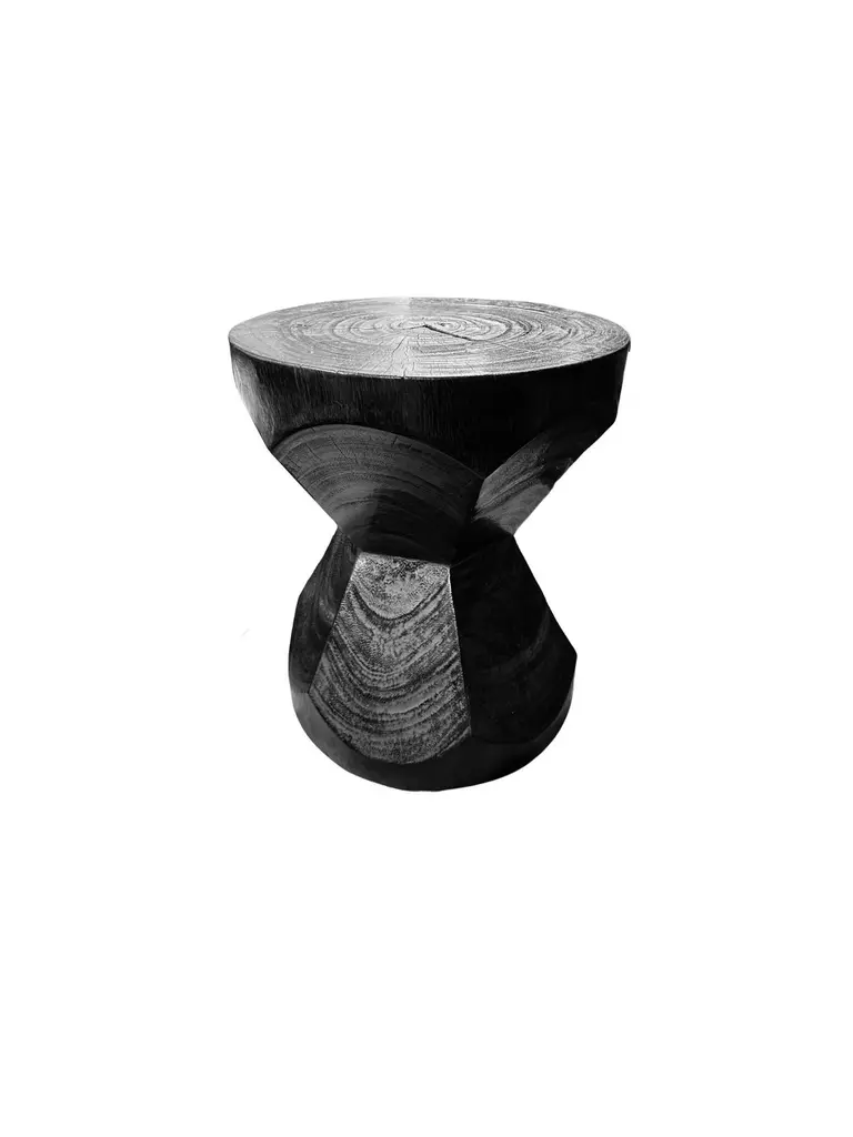 A wonderfully sculptural round side table. Its neutral pigments make it perfect for any space. It was crafted from a solid block of mango wood and features an elegant mix of curved and straight lines. To achieve its black color the wood was burnt three times and then coated with clear finish. The wood texture present on all sides adds to its charm.