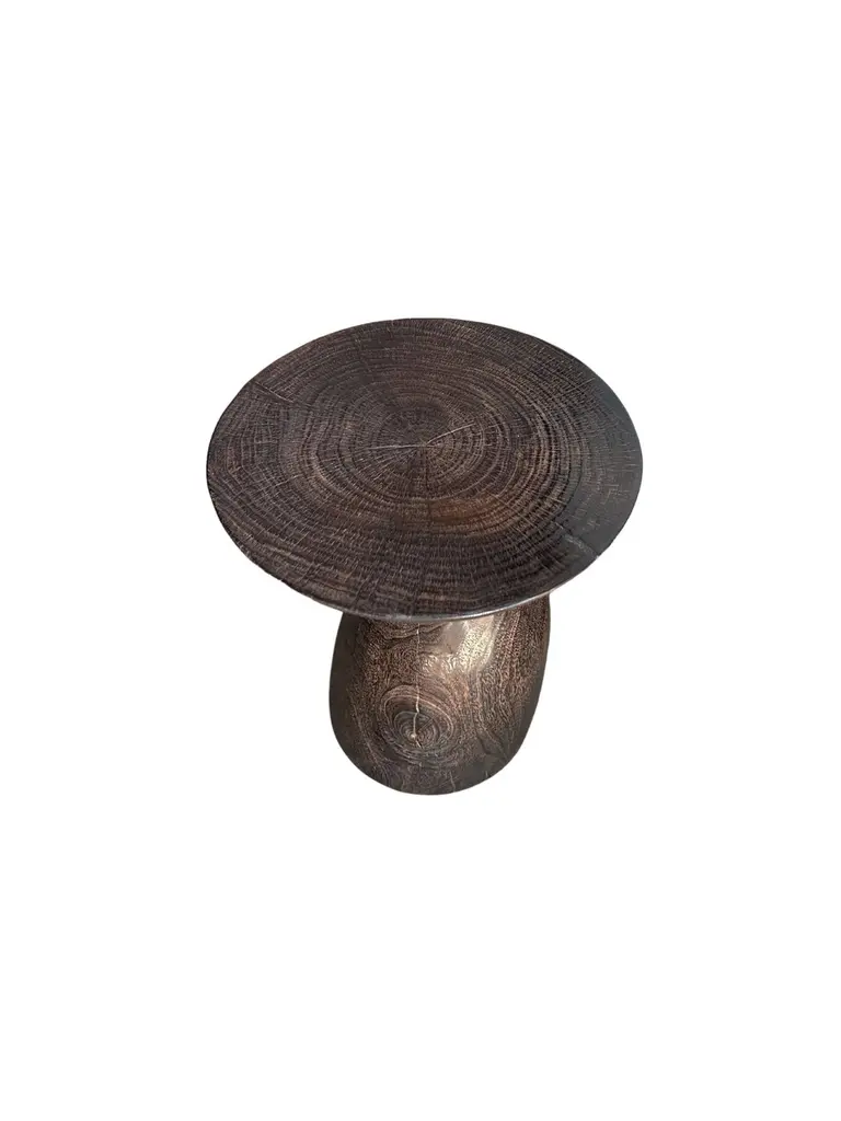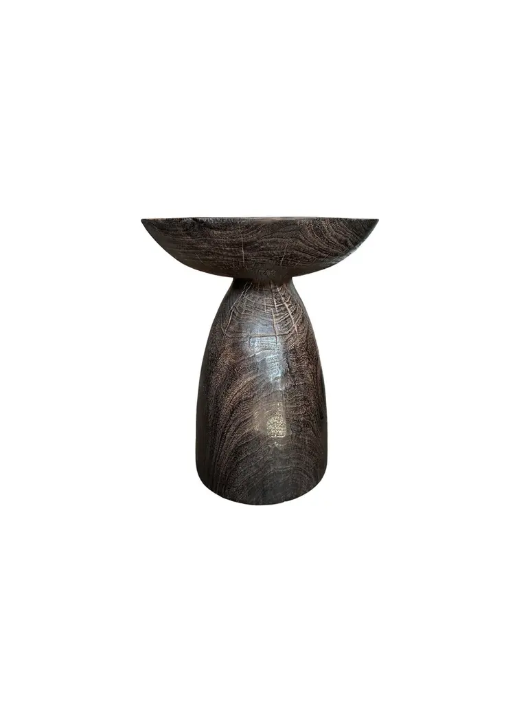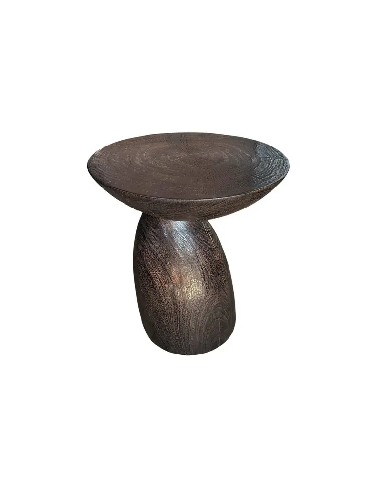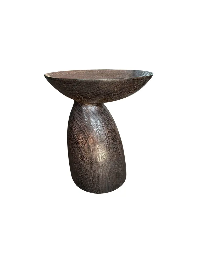 A wonderfully sculptural round side table, with an hourglass shape. Its neutral pigments make it perfect for any space. A uniquely sculptural and versatile piece certain to invoke conversation. It was crafted from a solid block of mango wood and has a smooth texture "espresso" finish. The espresso finish refers to the color achieved through a mixture of wood stains and a burning process. The wood texture present on all sides adds to its charm.