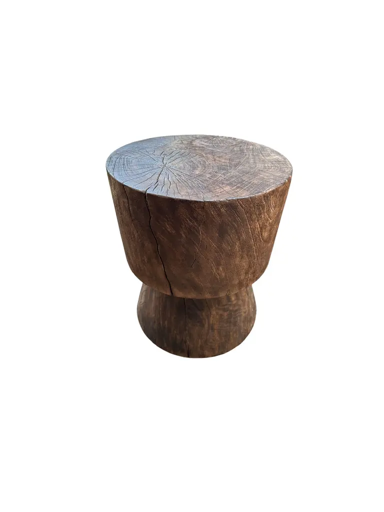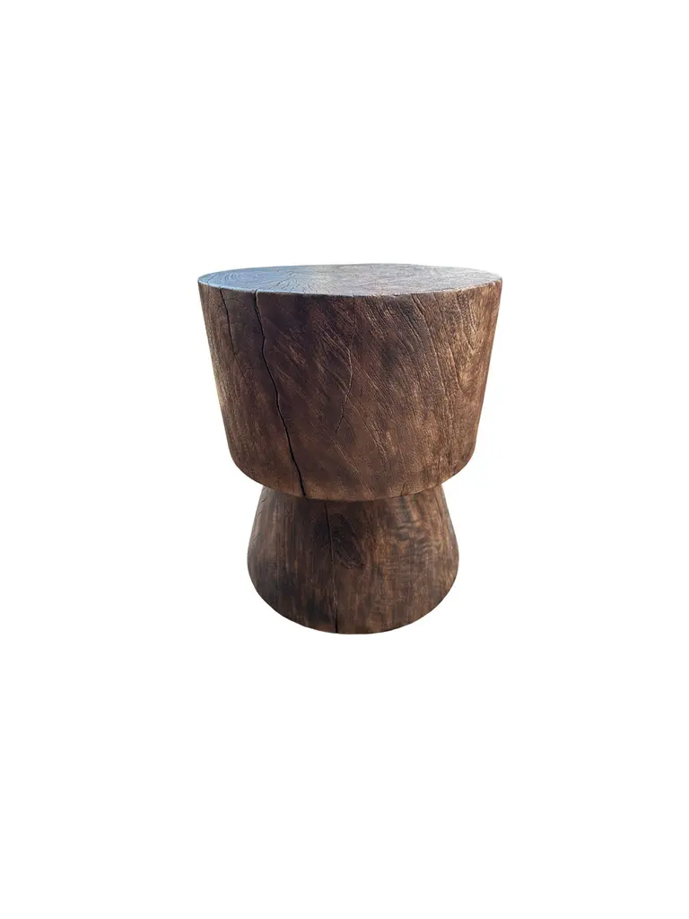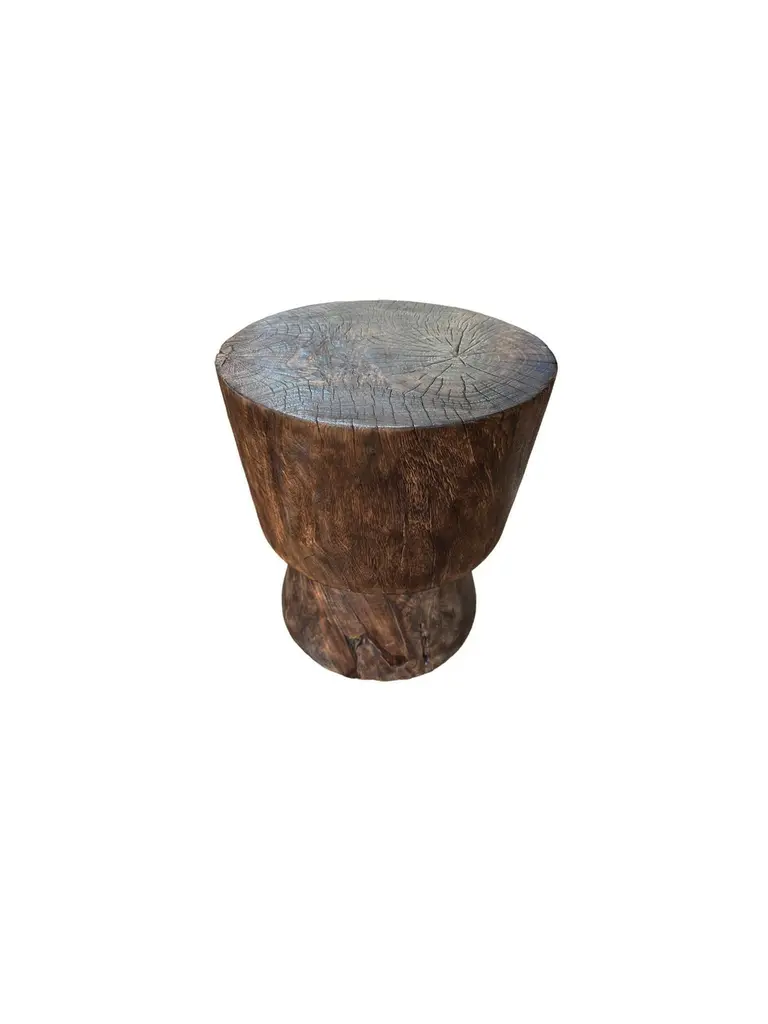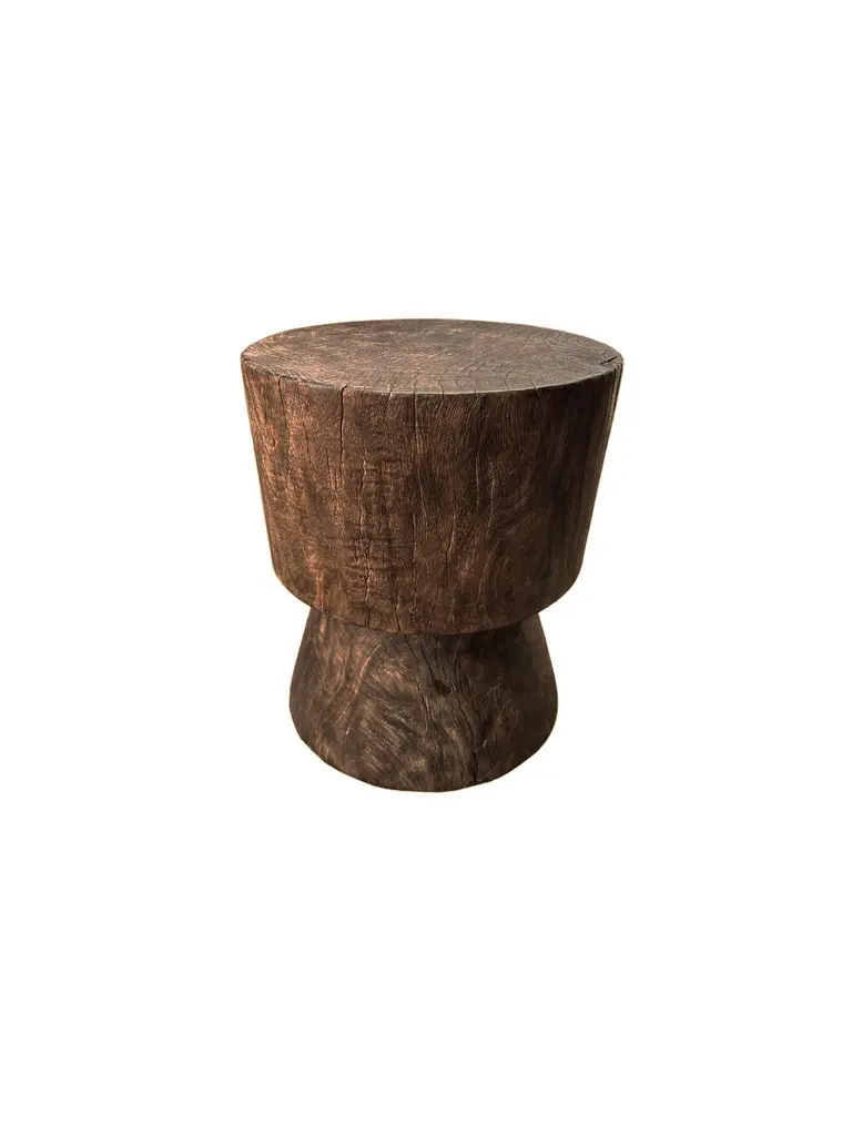 A wonderfully sculptural round side table. Its neutral pigments make it perfect for any space. A uniquely sculptural and versatile piece certain to invoke conversation. It was crafted from a solid block of mango wood and has a smooth texture "espresso" finish. To achieve this burnt finish the wood was sanded and coated with a dark brown finish. The wood texture present on all sides adds to its charm.