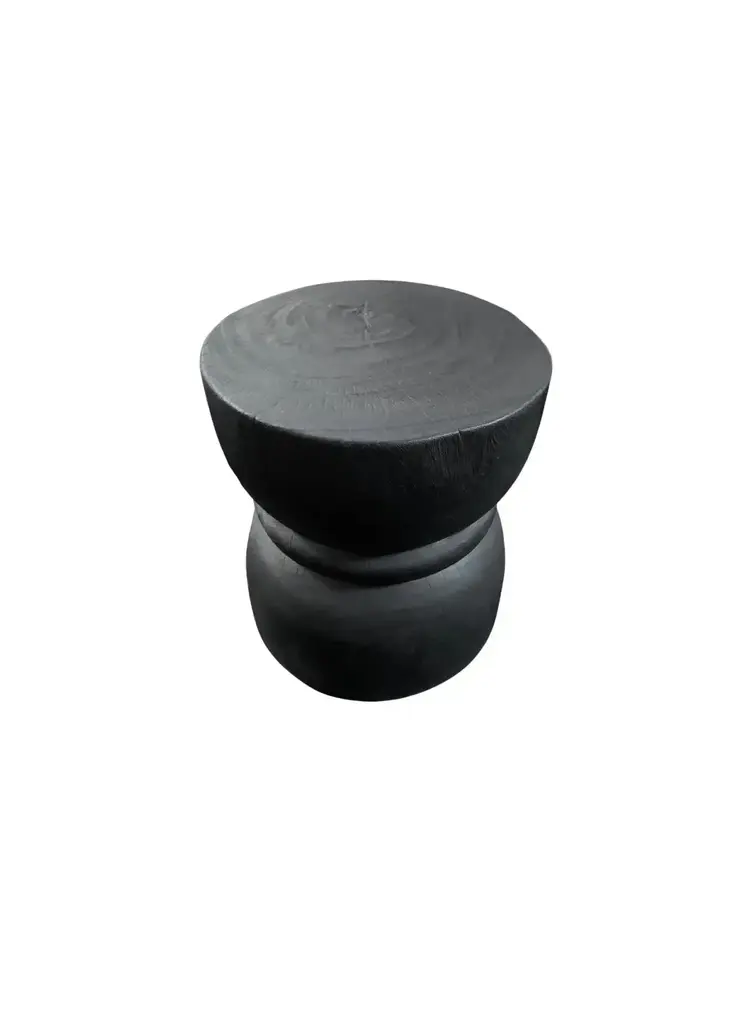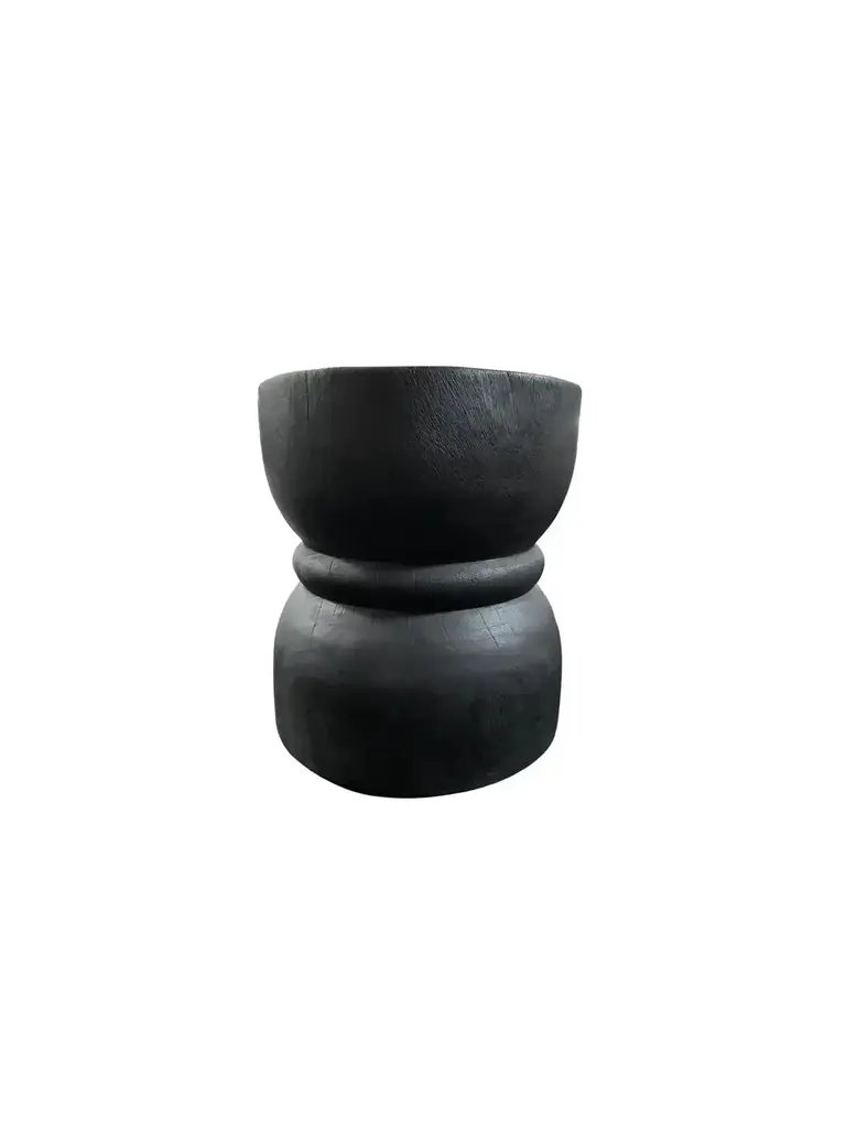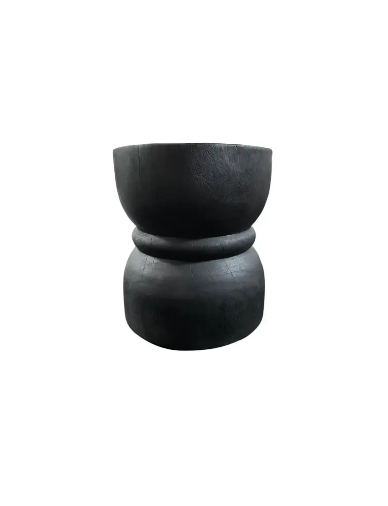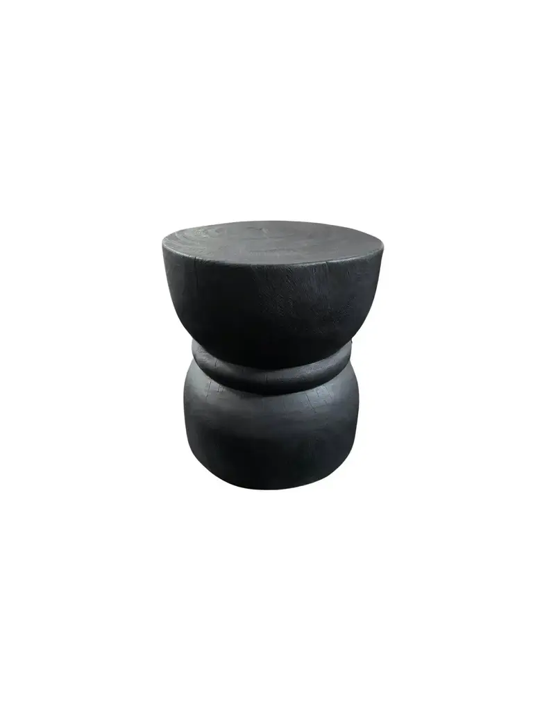 A wonderfully sculptural round side table. Its black pigment was achieved through a burning process creating both a wonderful colour and effect. Its neutral pigment and subtle wood texture makes it perfect for any space. A uniquely sculptural and versatile piece. This table was crafted from mango wood and has a smooth texture.