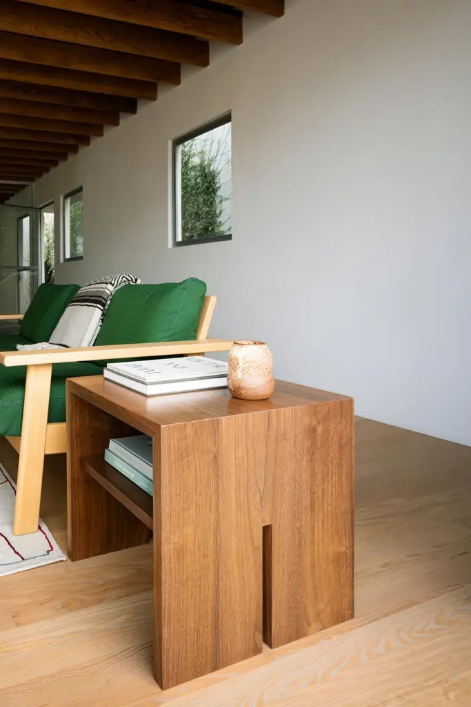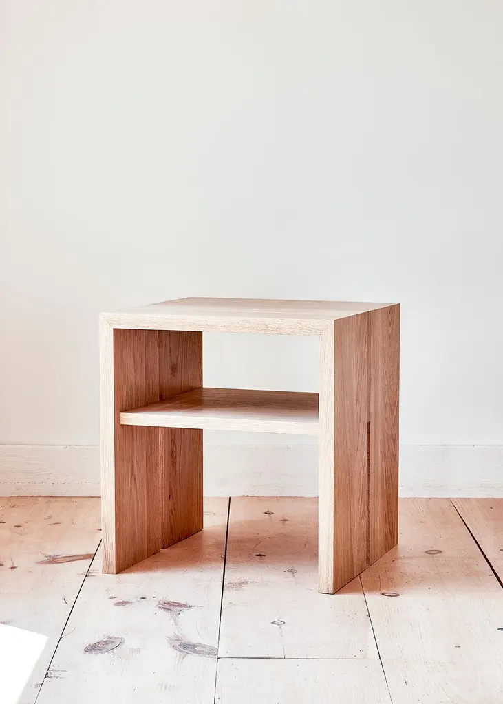 This wooden side table is hand-made in the United States with all hardwood construction. Characterized by its striking waterfall design, unique split leg detail, and convenient storage shelf, the Jameson natural wood side table is distinguished with its minimalist walnut inlay detail. This modern wood side table looks beautiful in a rustic design or contemporary space with clean lines. This piece can be ordered in Oak, Walnut, Ash or Matte Black.Jameson Collection by Lynnea Jean.Inspired by a 20th century primitive stool, the Jameson collection is the first furniture line from Lynnea Jean Interiors.Known for her laidback California aesthetic merged with classic silhouettes, Lynnea Jean is inspired by pieces lovingly passed down through generations. The custom furniture collection features luxurious clean lines and fine details, resulting a timeless aesthetic. Additionally, we only work with the finest, sustainably sourced materials. Dedicated craftspeople build each piece by hand with meticulous detailing in their downtown Los Angeles workshop.Lynnea Jean offers complete custom capabilities to the trade. To inquire, specify the dimensions, select the finish and consider adapting the design details. From where you create to where you dine to where you sleep, the Jameson collection is here to become a part of your everyday moments and your most cherished memories.
