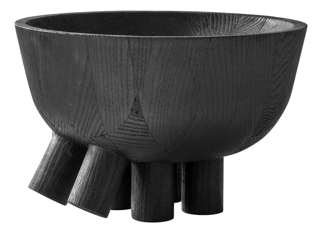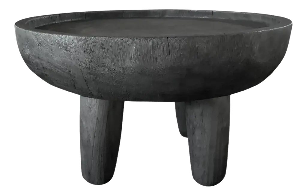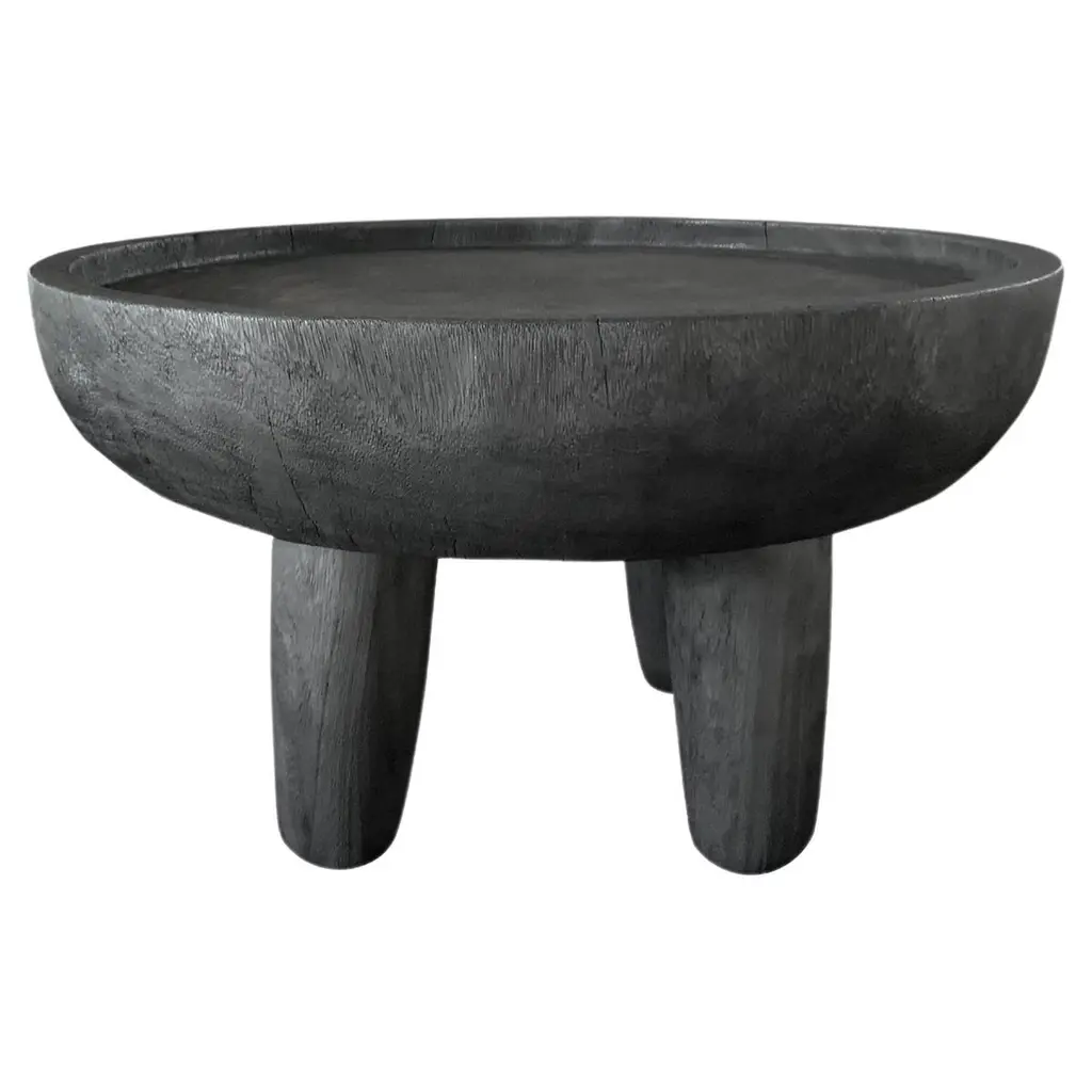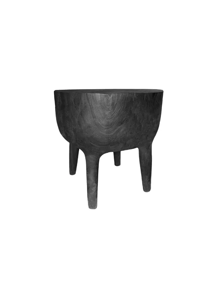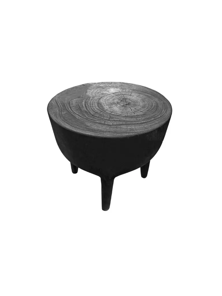 A wonderfully organic round side table that sits on 4, elongated, arched legs that blend with its form. The proportions make for a very elegant object. Its neutral pigment and subtle wood texture makes it perfect for any space. This table was crafted from a solid trunk of mango wood. To achieve its pigment the wood was burnt numerous times and then finished with a clear coat.