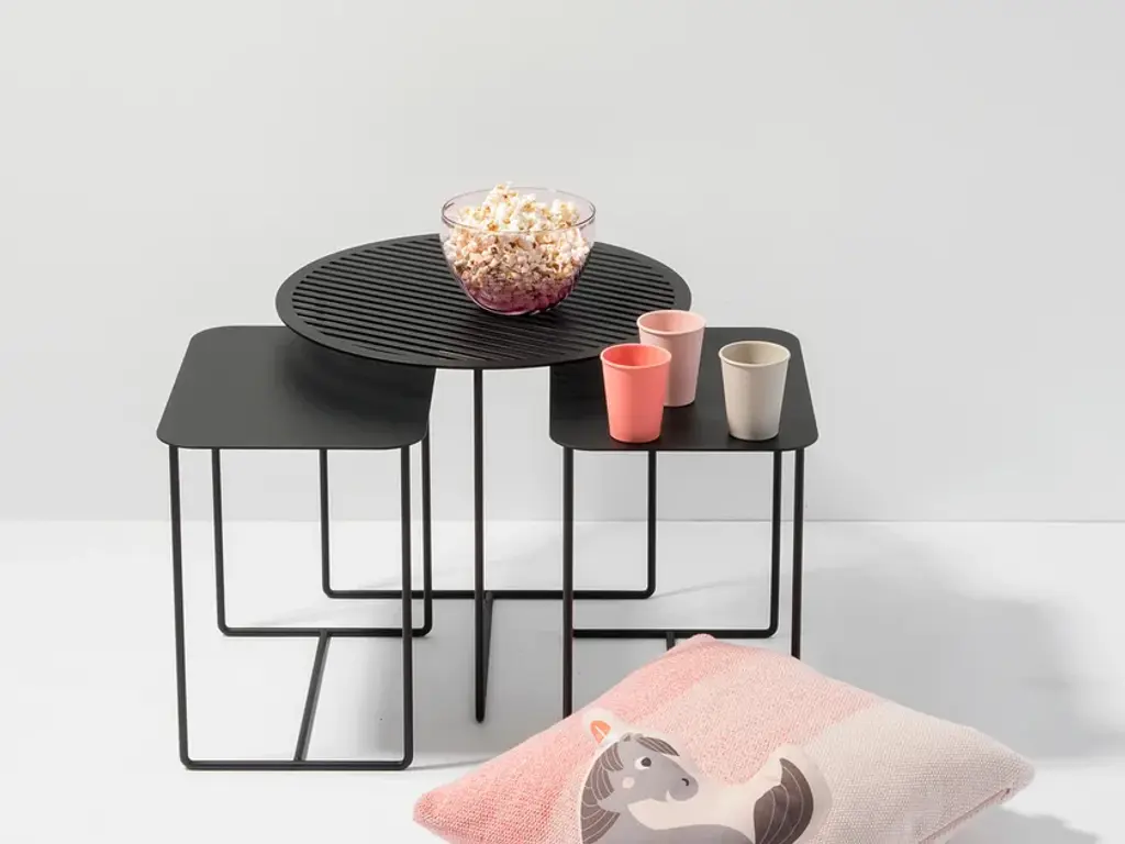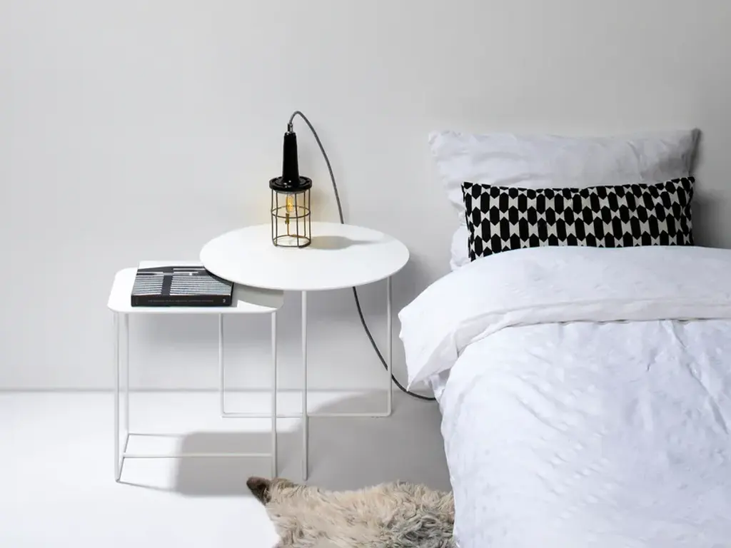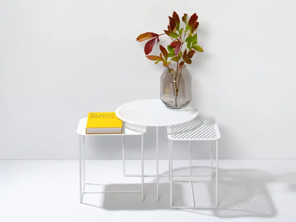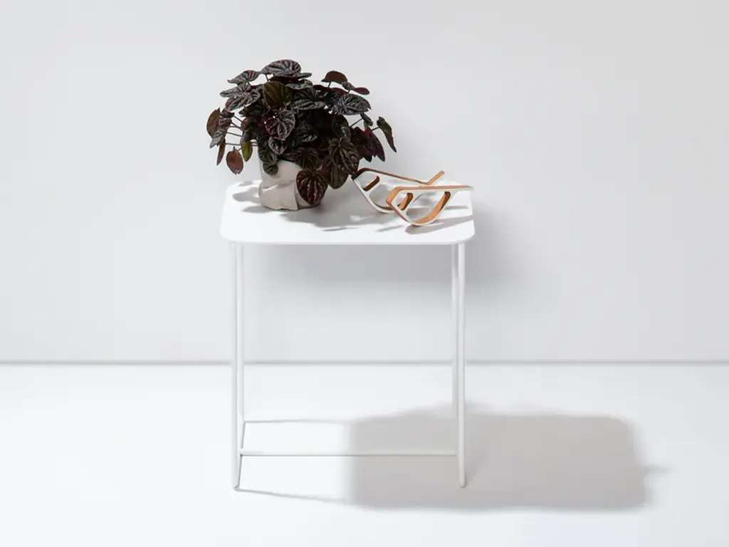 This compact side table feels at home everywhere – as a plant stand in your urban jungle, an end table next to your couch or armchair, or a practical entryway table or nightstand. The flexibility of the Solid 02 Side Table knows no bounds. The elegant rectangular solid tabletop is supported by a frame of round iron bars for a look that’s understated yet full of personality.Its low height allows the Solid 02 Side Table to fit perfectly under the round side tables of the Solid & Grid collection, letting you create attractive groupings. Its u-shaped legs makes the Solid 02 Side Table suitable for patios and balconies as well. Available in black and in white.Material: Sheet steel and round iron bars with powder coatingPurchase includes: Side tableIn designing our Solid & Grid collection, we set out to create a style-defining, recurring graphical structure for furniture and home accessories. We were aiming for a pattern that looks light and elegant while offering sturdy durability. And we achieved this with a diagonally cut grid made of steel. After we came up with our first models featuring diagonal slits, we designed several solid versions as well. All furniture and home accessories in the Solid & Grid collection are precisely cut using a laser and covered with a durable powder coating.