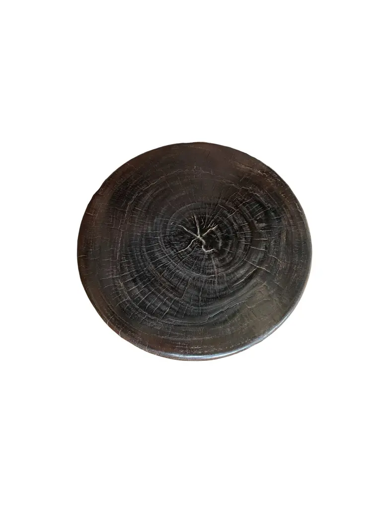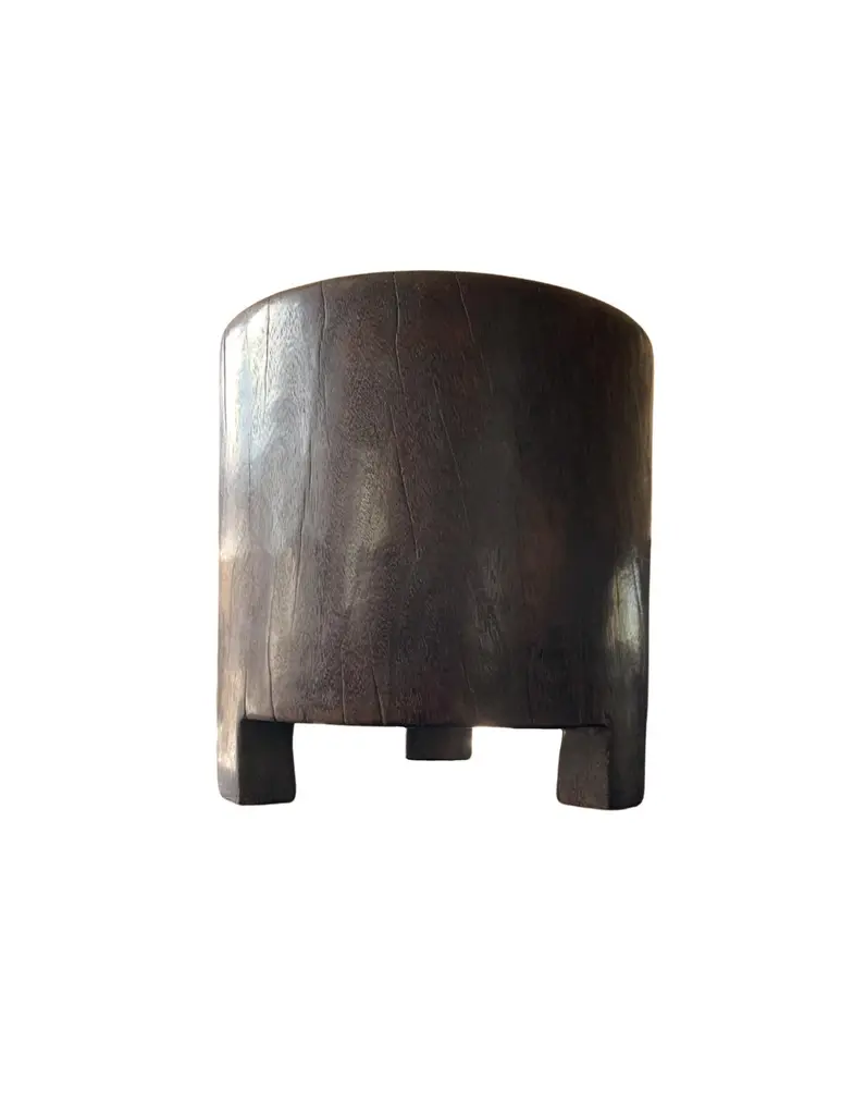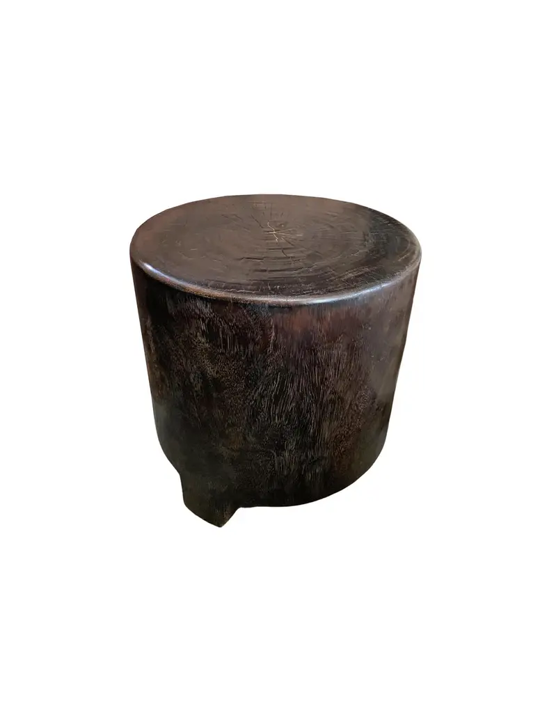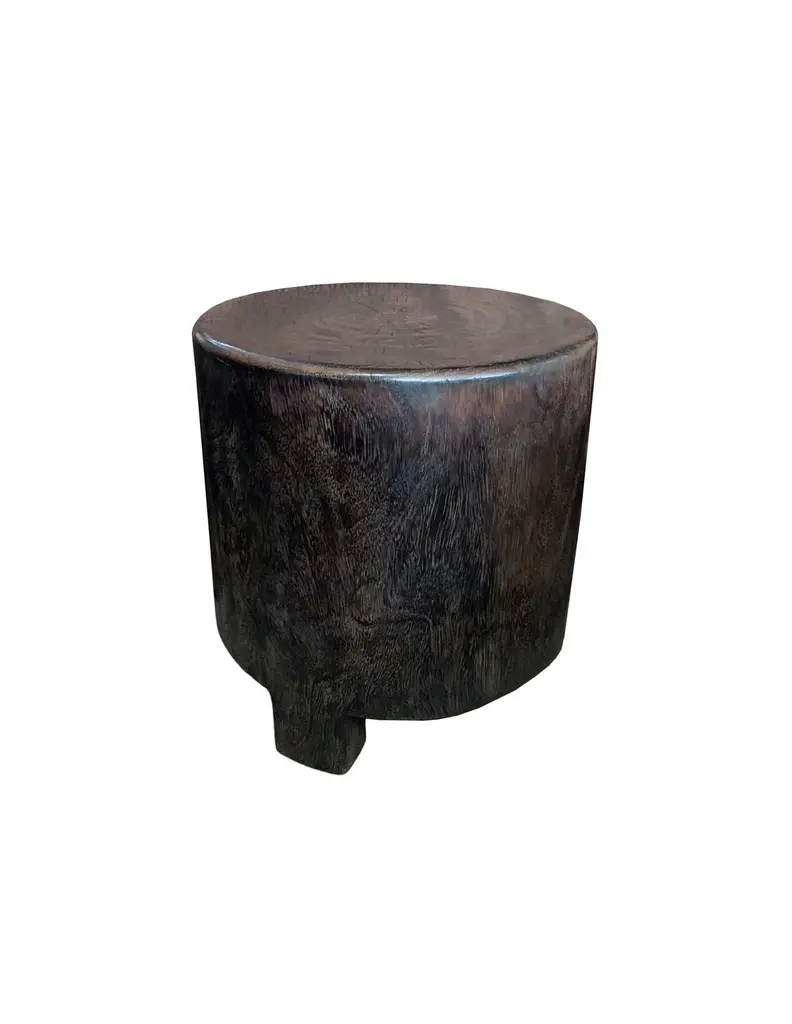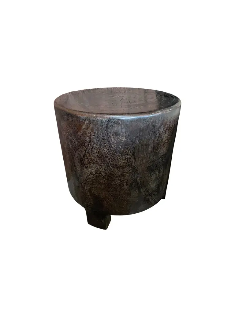 A wonderfully sculptural round side table. Its neutral pigments make it perfect for any space. A uniquely sculptural and versatile piece certain to invoke conversation. It was crafted from a solid block of suar wood and has a smooth texture finish. The wood texture present on all sides adds to its charm. The table is elevated on three short legs.