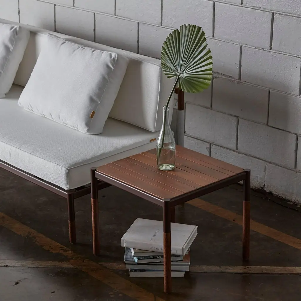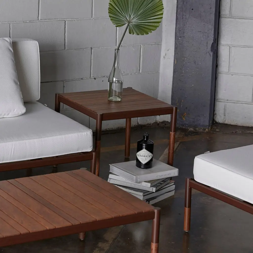 Theis side table is made for outdoor use. The side table is produced in metal in a minimalist design, it is a side table that combines thin solid wood thickness with a heavy duty body, uniting the sweet and mellow appearance of the top with the strong and technological aesthetics of metal, this object is part of the skyfolding outdoor collection explained in detail bellow: Skyfolding In-Outdoor collection, the collection concept is inspired by the Asian building scaffoldings, where a structure is composed by bamboo sticks crossed to create this inspiring and fascinating structures. We combined elements of this structures and also references from the ballet stretching bars that often combine metal and wood, this combo is the concept very soul. All the figurative elements are abstracted in the design process to extract the precise best of each world, and by then resulting in a collection of delicate objects, cult and curated to the minimum details, in design and engineering. The collection is composed by outdoor net, batyline or plastic, in a portion leaving room to a more soft design approach that is harmonious, this elements are combined to a structure made of wood and metal that transcends to tech and soft, a paradigm of past, present and future that invite all the viewers to contemplate and reflect in this philosophical matters in a tactile and visual way. Resulting is a essential and timeless set of objects designed for the modern lifestyle that permit infinite compositions indoors or outdoors that will participate in lives for a lifetime like a breeze full of “zen” elements and energy. Award winner of the biggest South American design award the - Salão Design, 1st place for the industry category.