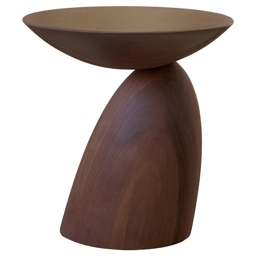 The Moda side table plays with a series of shapes and curves to create a stunning style. The base features a half sphere tucked against a straight-edge back, and the top showcases a semicircle form. The woodgrain is highlighted with an Aurum finish.