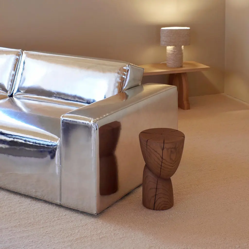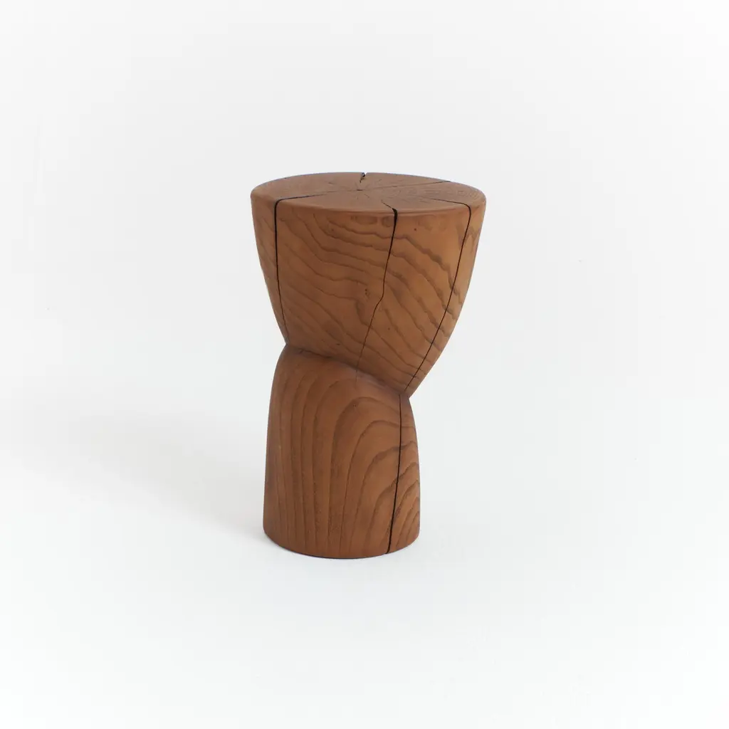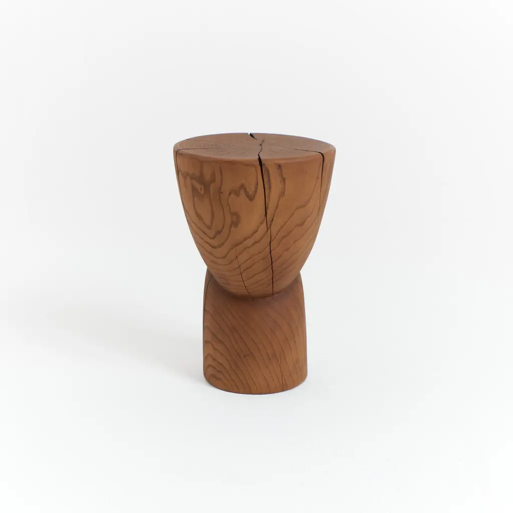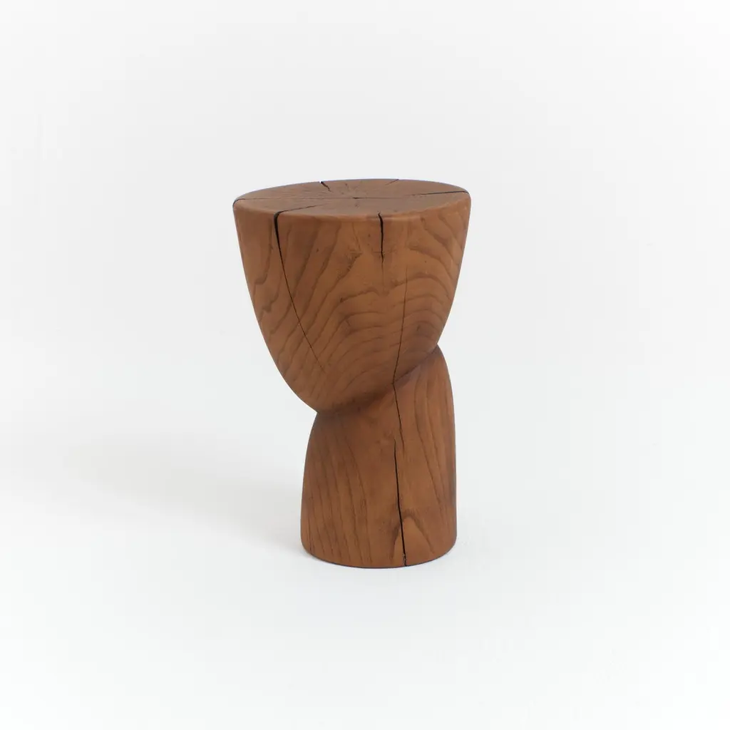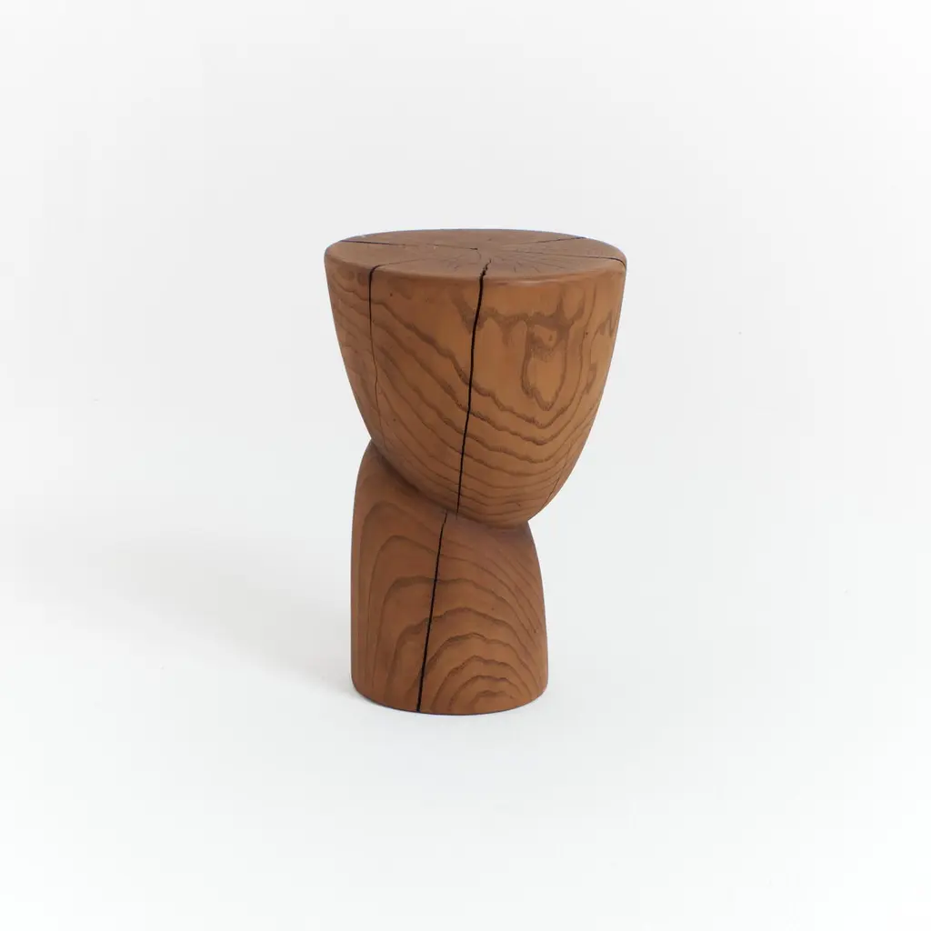Wooden side table in solid wood with an oiled finish.Designed by Project 213A in 2020 This sculptural side table is hand carved by local artisans in Portugal using solid chestnut which shows the natural grain and characteristics of the wood.Available in natural or darker brown finishes.Each stool has a unique surface pattern and has beendried over a long period of time to enhance itsindividual marks and cracks.Further drying of the wood can result in deepercracks. Not suitable for outdoor useLead time: 10-12 weeksMaterial: ChestnutDimensions: H 43.5 cm x W 30 cmWood is a natural material that can vary slightly in tone, appearance and may show some imperfections over time, this makes each piece unique.Care instructions: Wipe clean with a dry non-abrasive cloth.