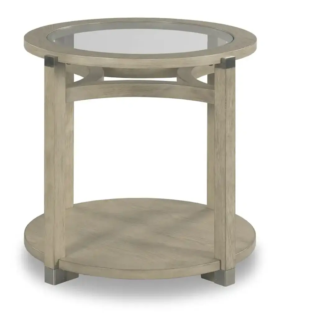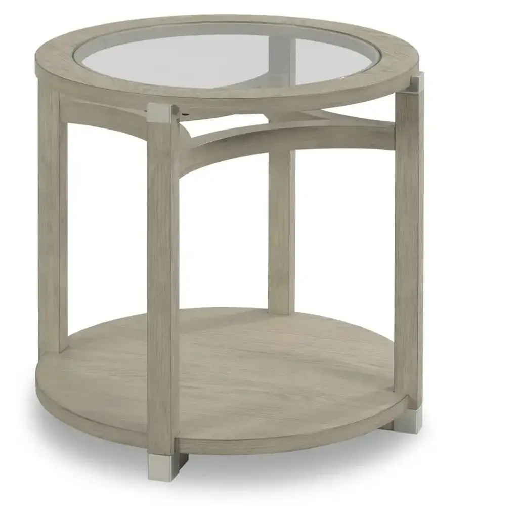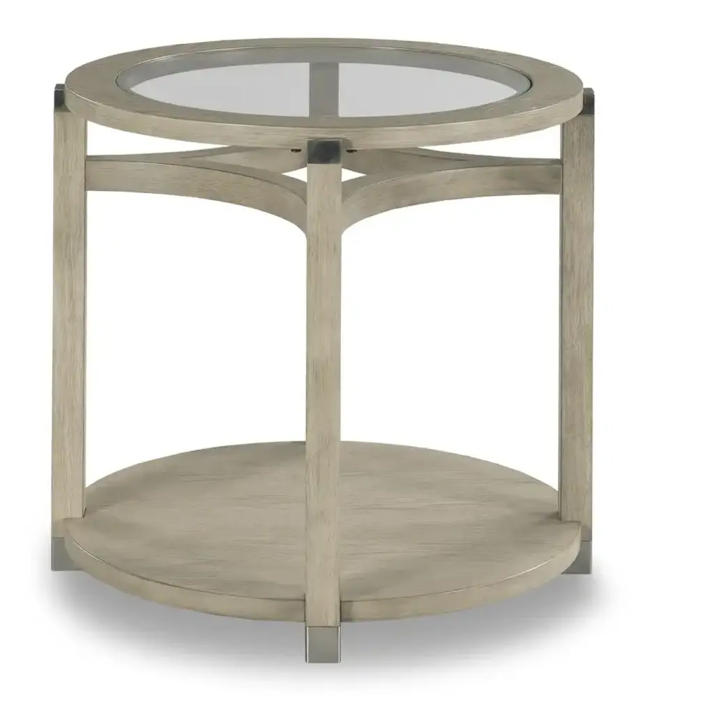 Introducing the Solstice Round End Table, a perfect companion piece that marries style with practicality. Crafted from rich White Oak veneers and select hardwoods, this table exudes warmth and sophistication. Its circular shape echoes the gentle curves of nature, while the inset glass top adds a modern touch and protects the beautiful wood grain beneath. Sleek metal accents provide a striking contrast, elevating the table's visual appeal. A thoughtfully designed lower shelf offers additional storage space, ideal for displaying cherished items or keeping essentials within reach. Whether placed beside your favorite armchair or nestled between sofas, the Solstice Round End Table serves as both a functional surface and an artistic statement, seamlessly blending into various décor styles while maintaining its distinctive character.