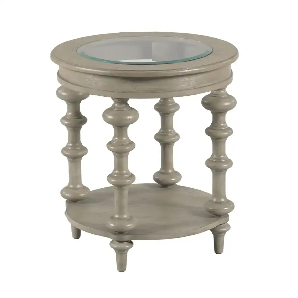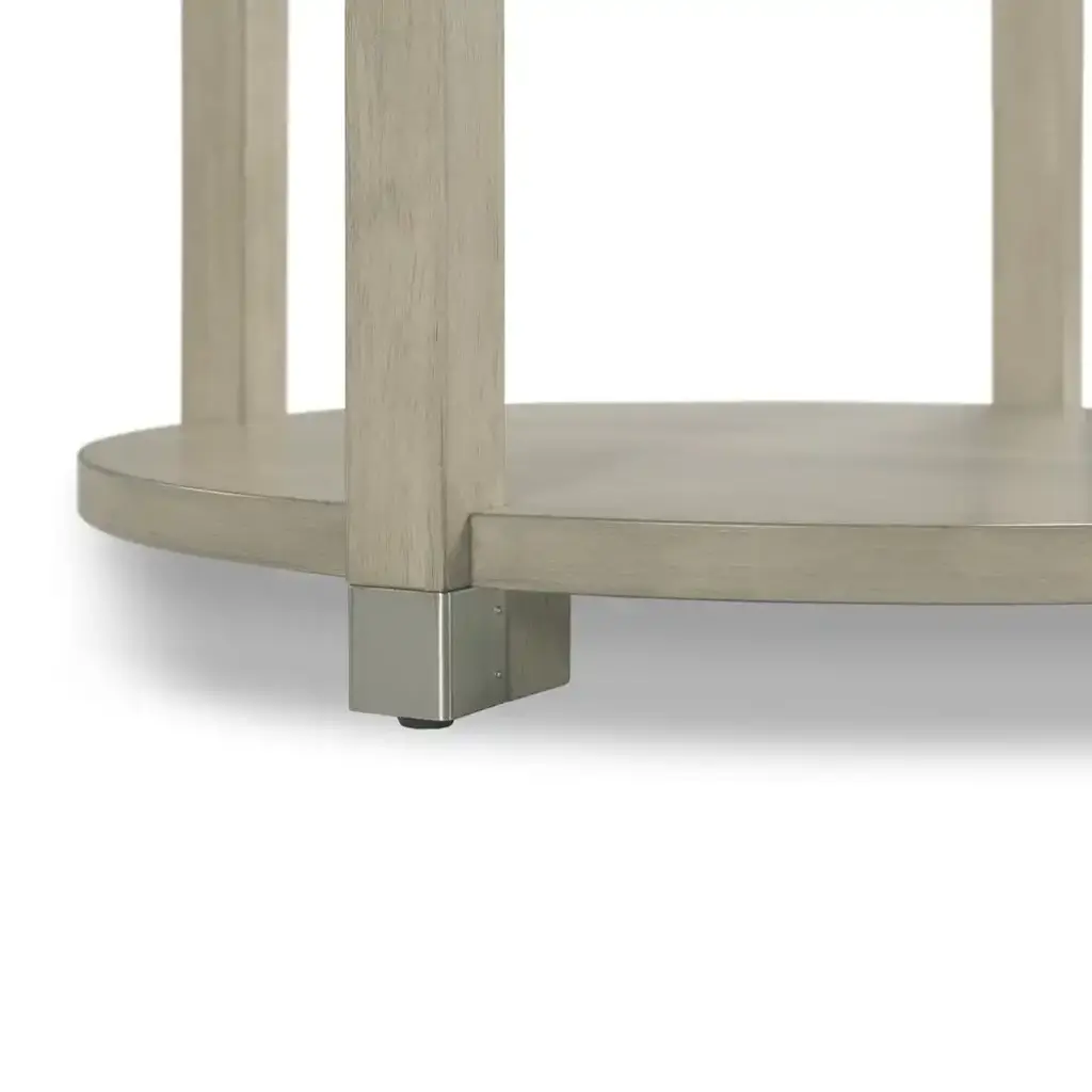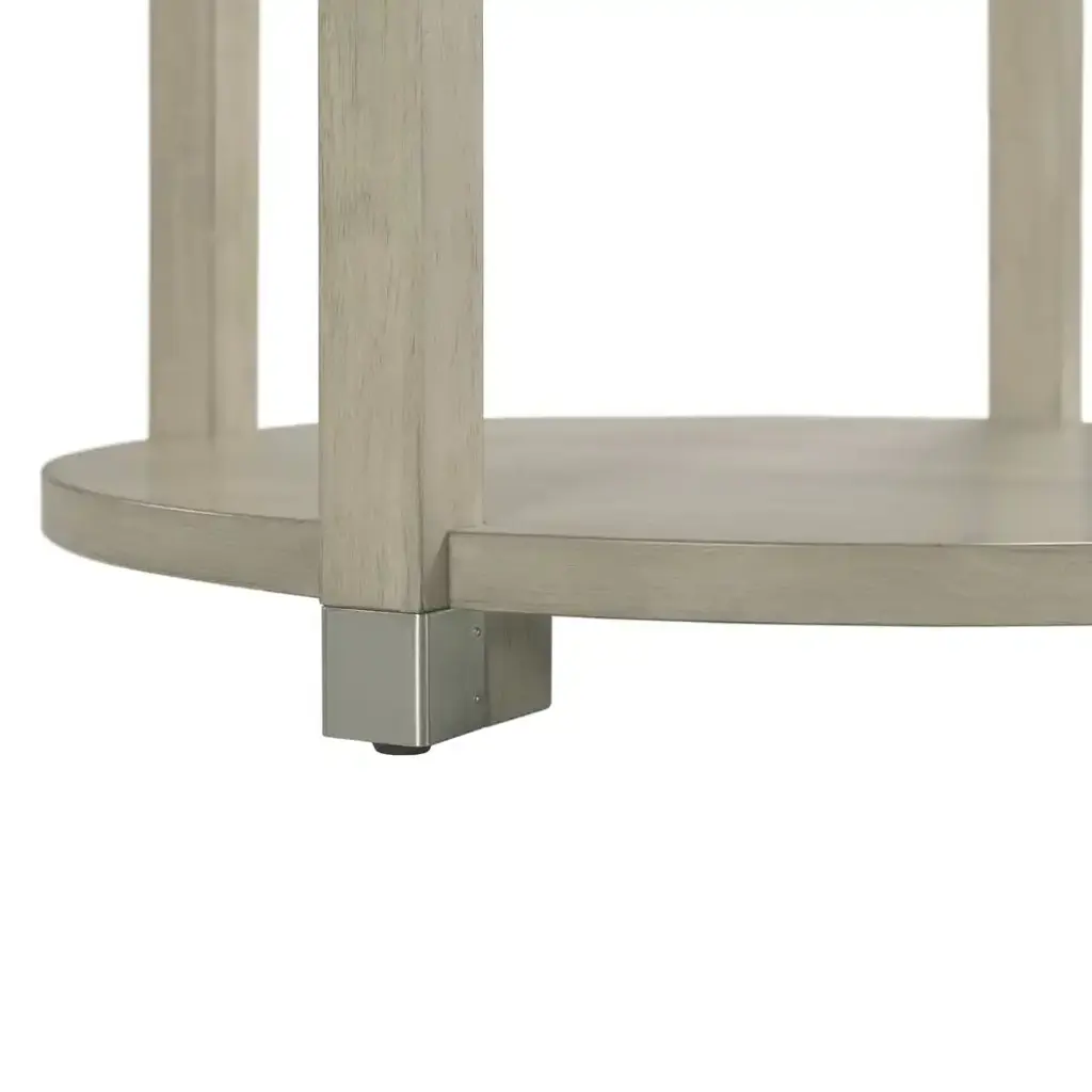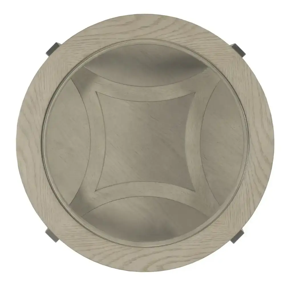 Introducing the Solstice Round End Table, a perfect companion piece that marries style with practicality. Crafted from rich White Oak veneers and select hardwoods, this table exudes warmth and sophistication. Its circular shape echoes the gentle curves of nature, while the inset glass top adds a modern touch and protects the beautiful wood grain beneath. Sleek metal accents provide a striking contrast, elevating the table's visual appeal. A thoughtfully designed lower shelf offers additional storage space, ideal for displaying cherished items or keeping essentials within reach. Whether placed beside your favorite armchair or nestled between sofas, the Solstice Round End Table serves as both a functional surface and an artistic statement, seamlessly blending into various décor styles while maintaining its distinctive character.