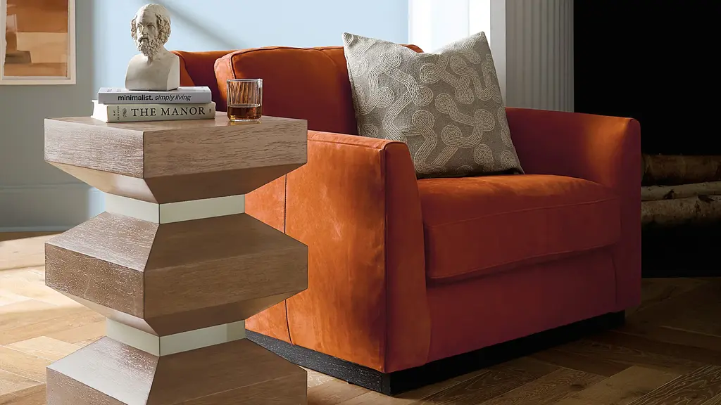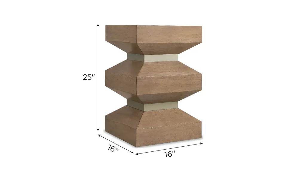 Symmetrical and chic, the Sonnet End Table design is a chunky geometric shape with two satin-finished metal waistbands. In a convenient, compact footprint that's 16 inches square, it is crafted of Quartered and Cathedral-Cut White Oak Veneers in a light earthen-toned finish.
