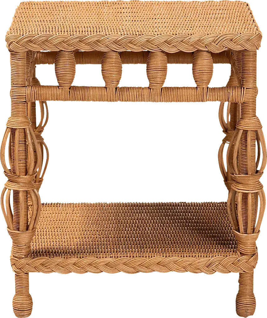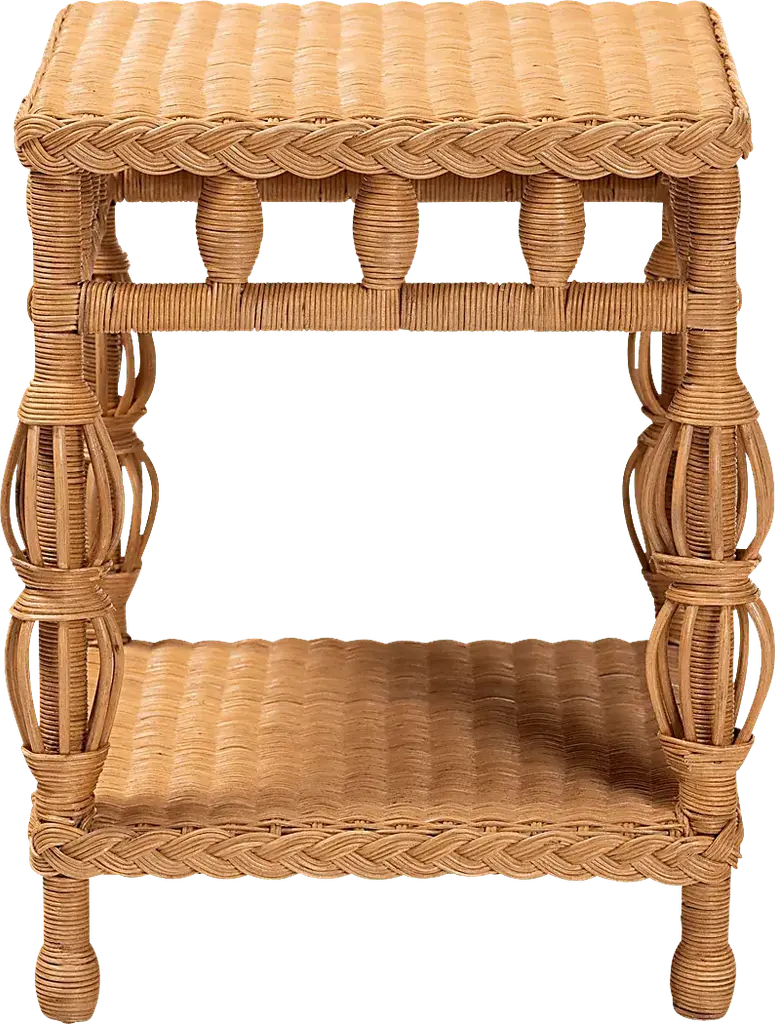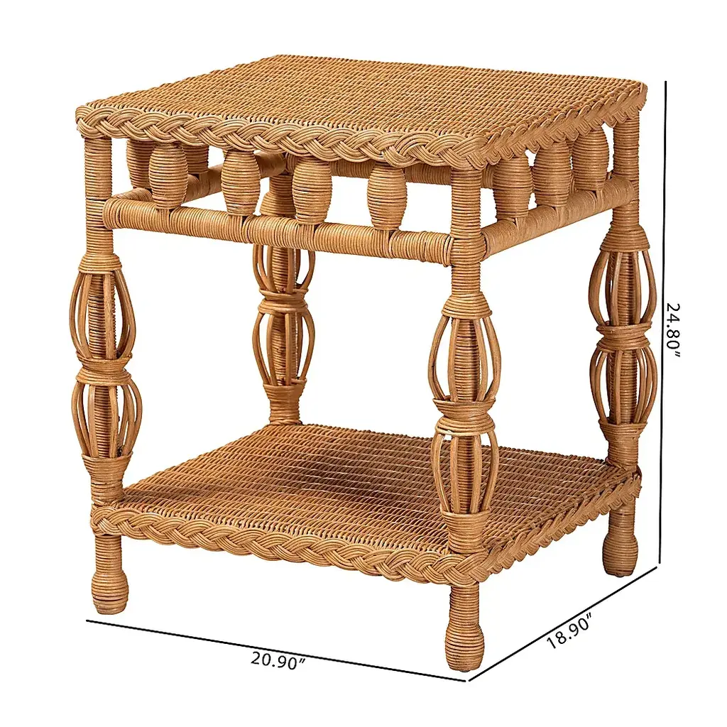 The incredible artistry of the Soulware natural end table brings an aura of rustic elegance to your space. This bohemian piece is handcrafted from sustainably sourced natural rattan. Its crisp tabletop and open shelf are beautifully accentuated by braided rattan embellishments for a chic modern look from any angle. The Soulware will arrive fully assembled and features flared rattan decor embellishments along its legs that add exotic flair to the familiar geometry of the piece. Rattan is a product of nature and may have variations in areas such as, but not limited to, color, pattern, grain and texture. The hair-like strands of rattan/rattan-fiber are common due to the nature of the material.