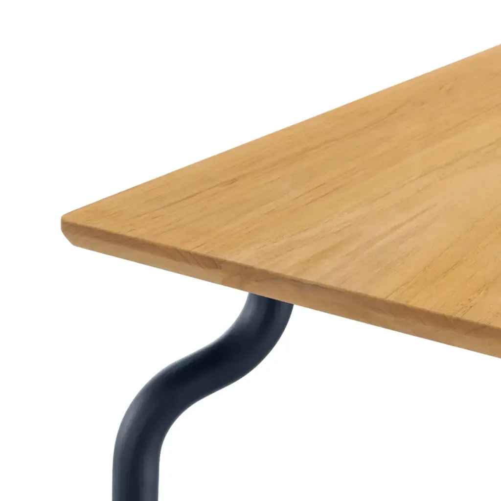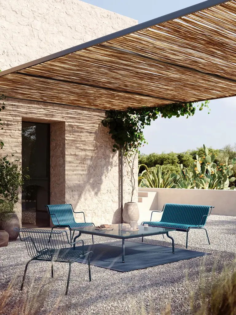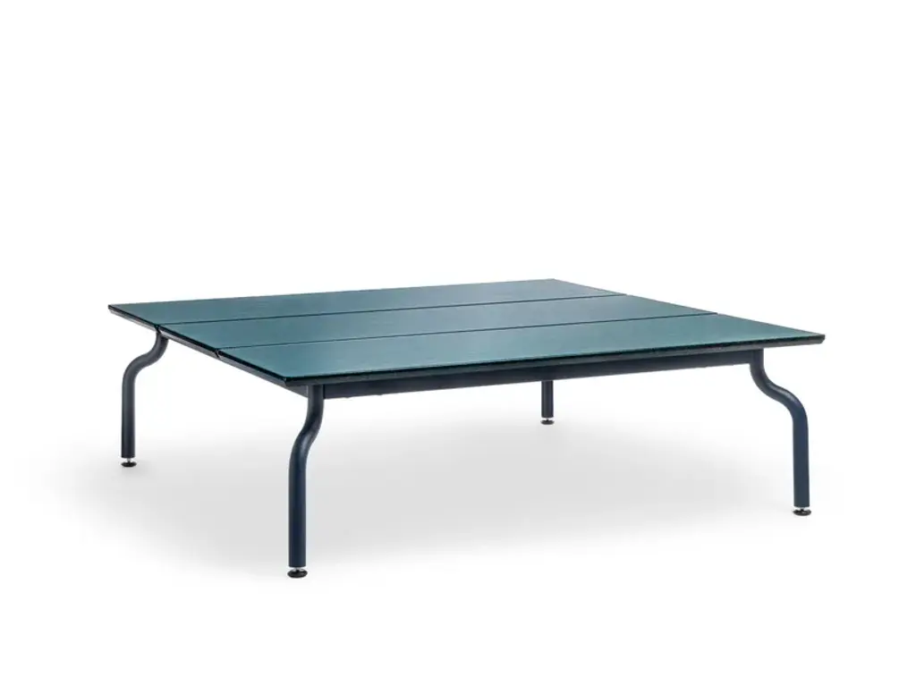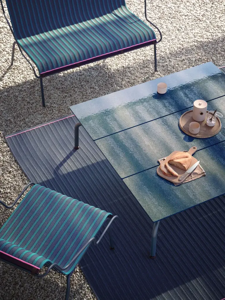 South is a low tables. Materials: frame in steel tube, cataphoretically treated and painted in polyester powder. Top in teak or lava stone. Adjustable and pivoting feet. Suitable for outdoor use.Accuracy is the essence of Konstantin Grcic’s work, and his new collection, South, designed for outdoors but ideal for indoors too, is no different. In cataphoresis-treated and powder-coated steel tube and wire, it is available in a range of colours: orange, bordeaux, light blue and night blue.Sinuous yet minimal, the collection consists of an armchair, a low armchair, a bench and a low bench, all with armrests. It also includes four tables (200x120 cm with top in teak slats, 200x90, 160x90 and 90x90 cm with top in steel sheet) and two coffee tables (120x120 cm with top in either teak slats or in lava stone enamelled with recycled coloured glass and 90x90 cm with top in steel sheet). The collection also features woven mattings for the seats, carpets, baskets and a plaid, all in the same outdoor-friendly fabric.As always, Konstantin Grcic combines formal rigour with a keen sense of design and architecture and demonstrates his passion for technology with careful research into materials and creative yet practical expertise.The South collection’s curved and inviting lines make explicit its direct and unconventional invitation to relax, resulting in dynamic comfort. To make the seats even more comfortable, a full (seat and backrest) woven matting can be secured to the shell with Velcro, offering a chic and practical alternative to classic cushions.