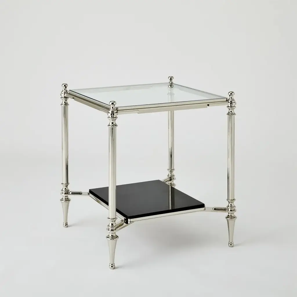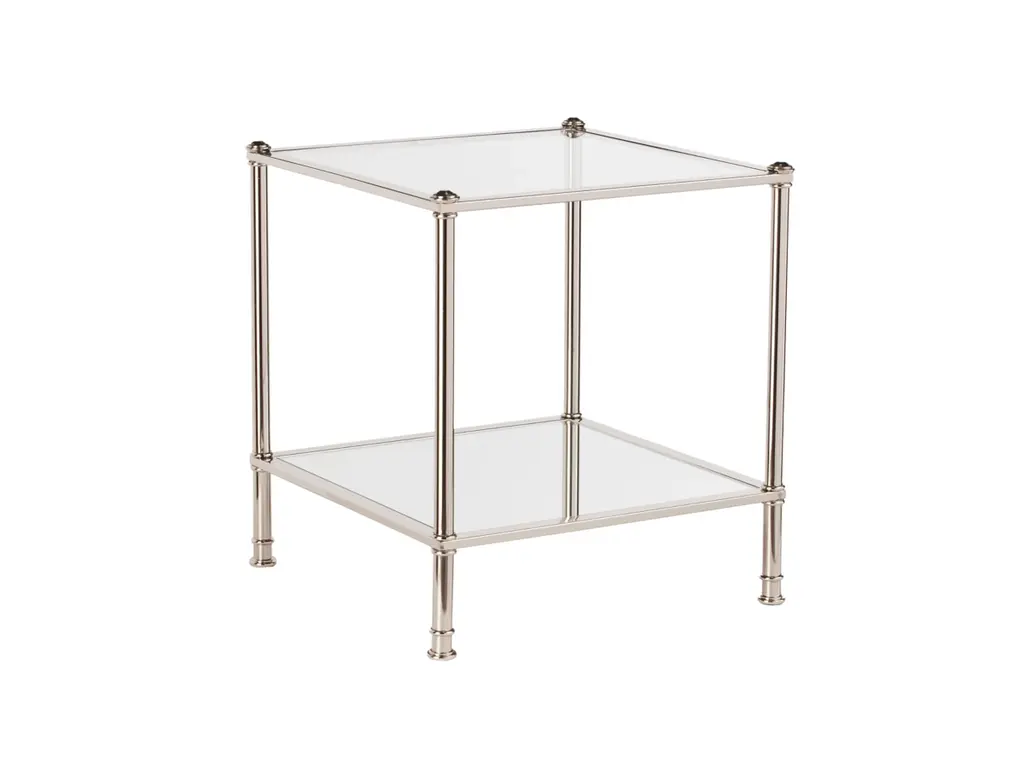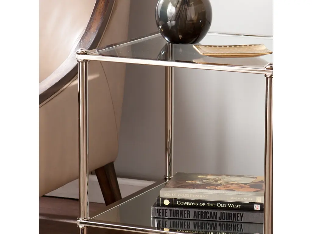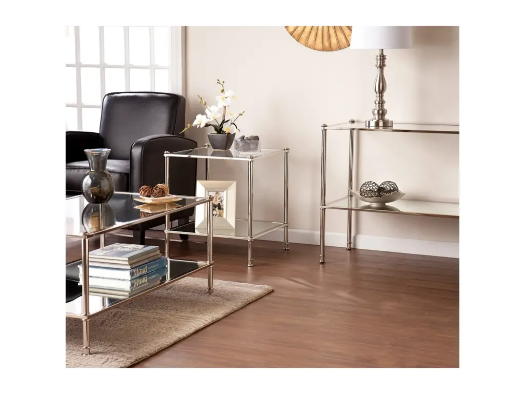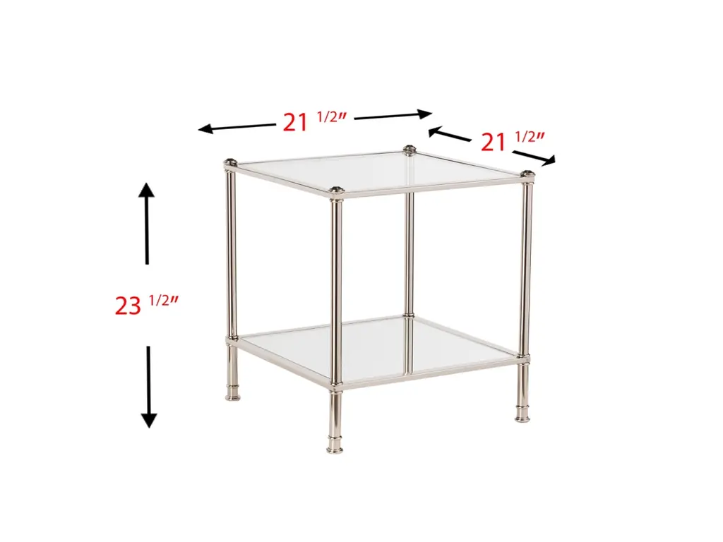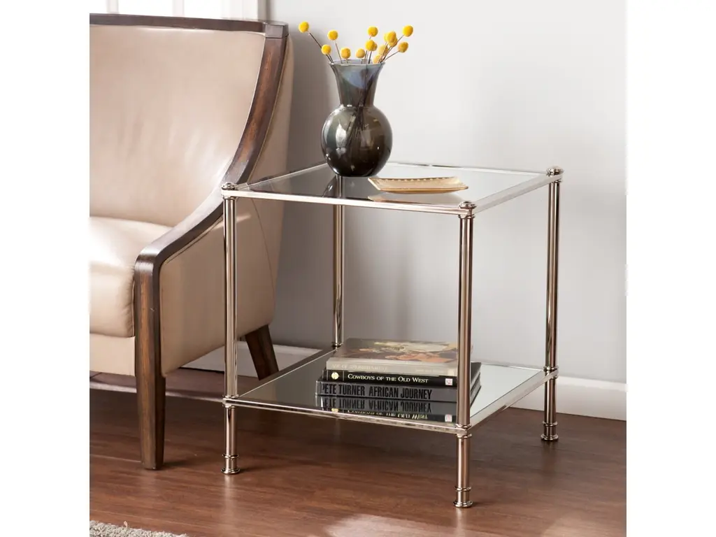 Add a little bit of shimmer in your life with this metallic silvertone end table. Reflective mirrored shelf has you seeing double and spacious glass tabletop has more than enough room for a chic table lamp and your current reads. Measure out a taste of the glamorous life with the tailored look of this end table in a reading nook, formal living room or bath.
