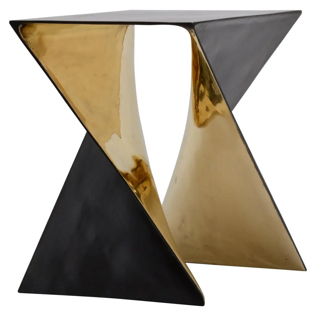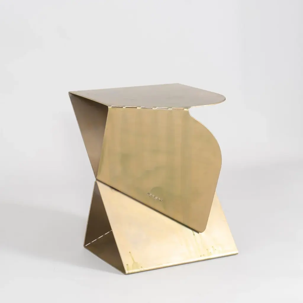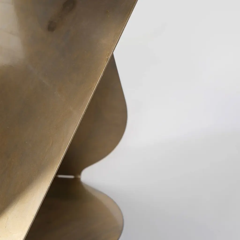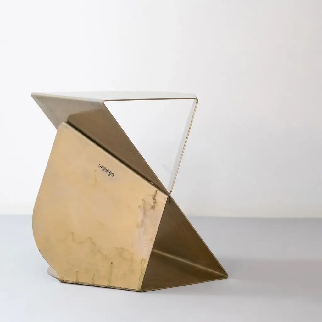 SovraP side table represents an exquisite fusion of contemporary design and Italian craftsmanship. It stands out for its unique structure, entirely shaped from a single piece of metal meticulously folded along multiple planes, giving rise to a captivating geometric form. It represents an experimental series in metal conceived and crafted by Enrico Girotti. The finish, achieved manually through numerous artisanal steps using brass powders and oils, imparts a unique character to each object.