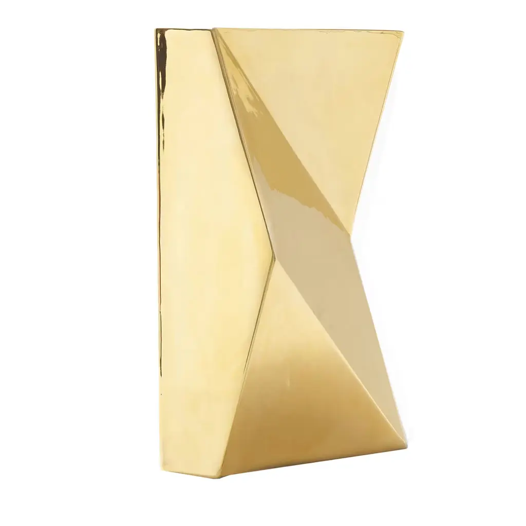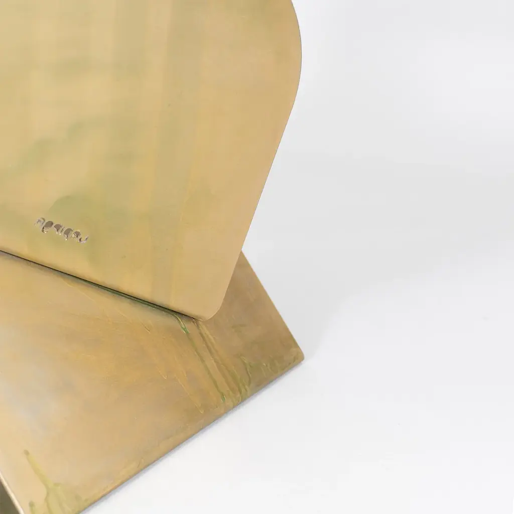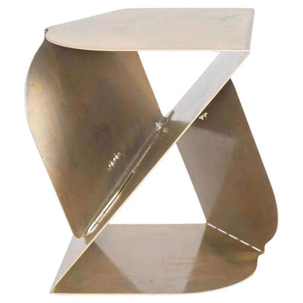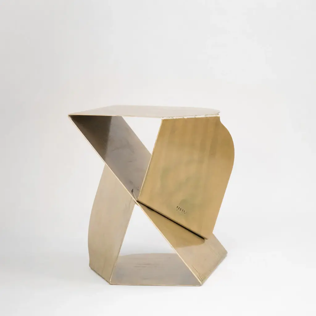 SovraP side table represents an exquisite fusion of contemporary design and Italian craftsmanship. It stands out for its unique structure, entirely shaped from a single piece of metal meticulously folded along multiple planes, giving rise to a captivating geometric form. It represents an experimental series in metal conceived and crafted by Enrico Girotti. The finish, achieved manually through numerous artisanal steps using brass powders and oils, imparts a unique character to each object.