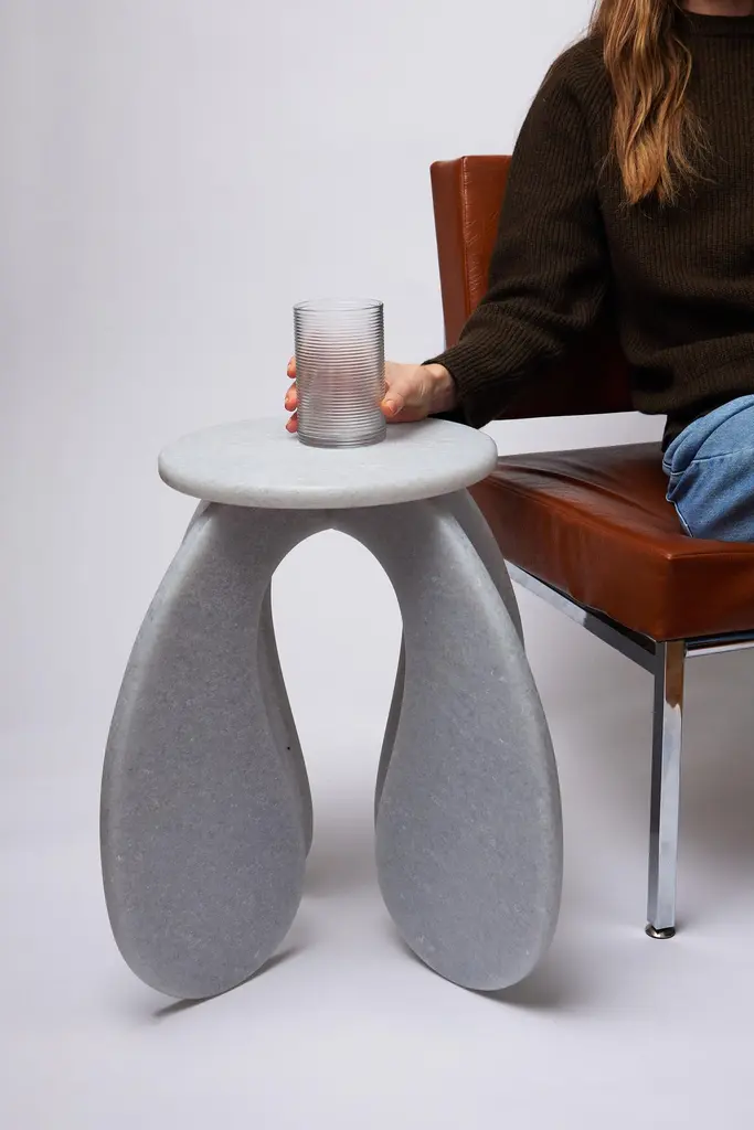 Maddy, the founder of squares & things was inspired by the Space Age and the sweeping architecture of Oscar Neimeyer's buildings for her second collection of furniture - SPACE Collection. The SPACE side table designed by squares & things gets reimagined in 100% recycled plastics making it part of the circular economy. Made entirely from plastic packaging, the table can be melted down to be recycled and repurposed at the Smile Plastics factory in Wales, U.K. The table is suitable for indoor and outdoor use, arrives fully assembled. Package includes care card. The surface is smooth and only needs to be wiped clean with a cloth. Also suitable as a stool for occasional sitting only. Produced by Make Relief studio in Brighton.